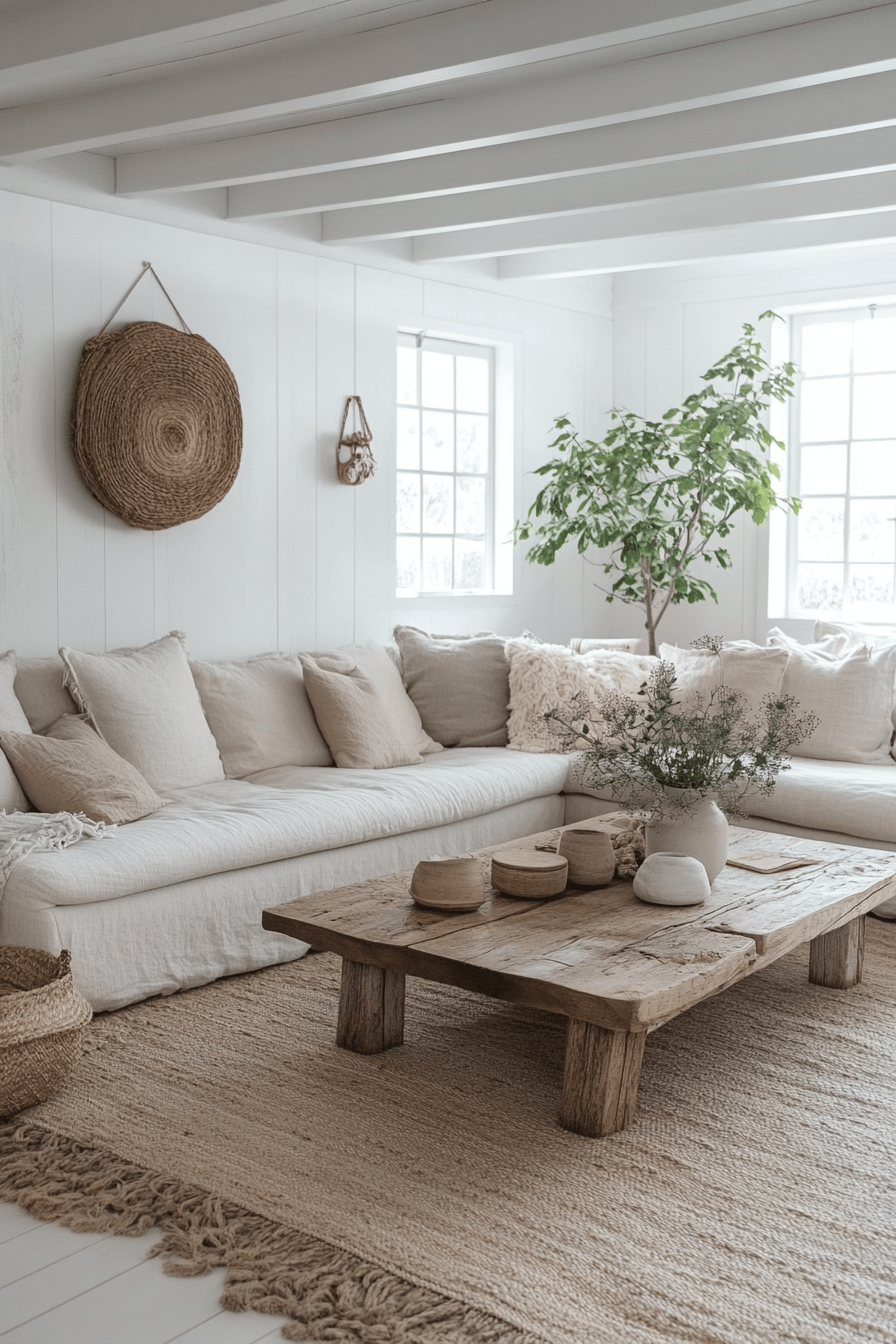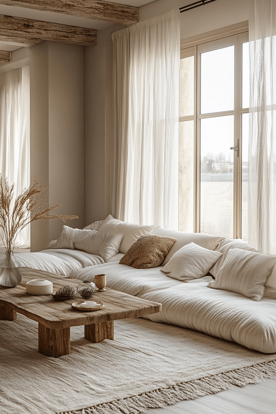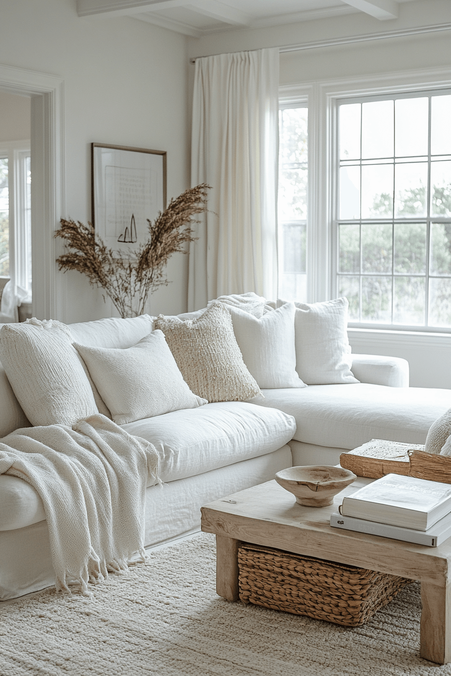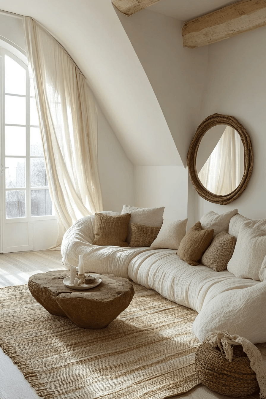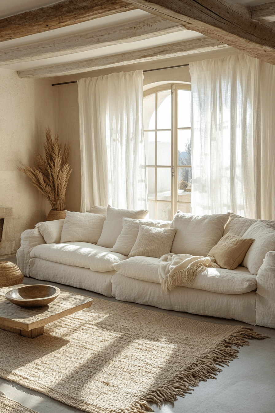 Brighten with ivory drift—soft white fabrics, sheer drapes, and textured rugs. Warm lighting enhances the palette. Add tactile details for comfort. The look is timeless and serene.