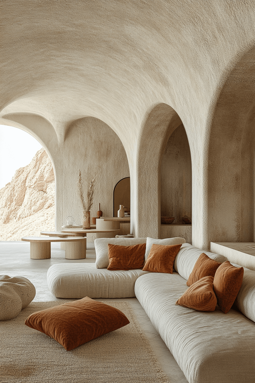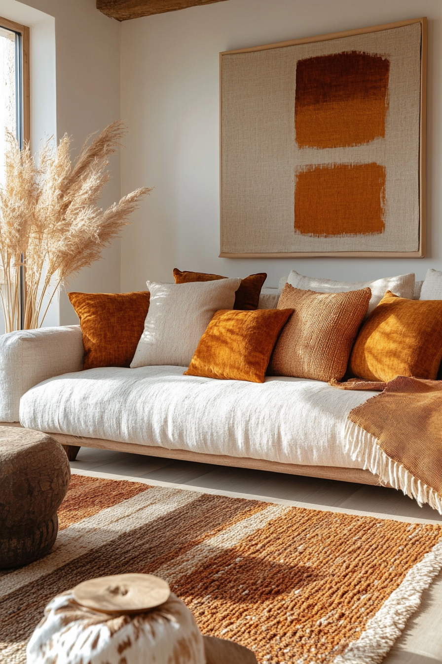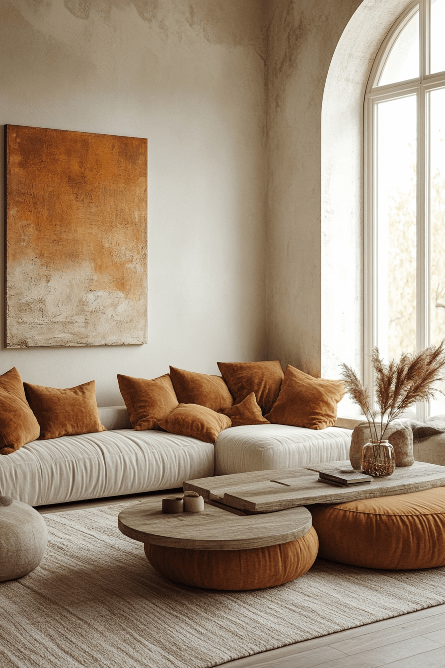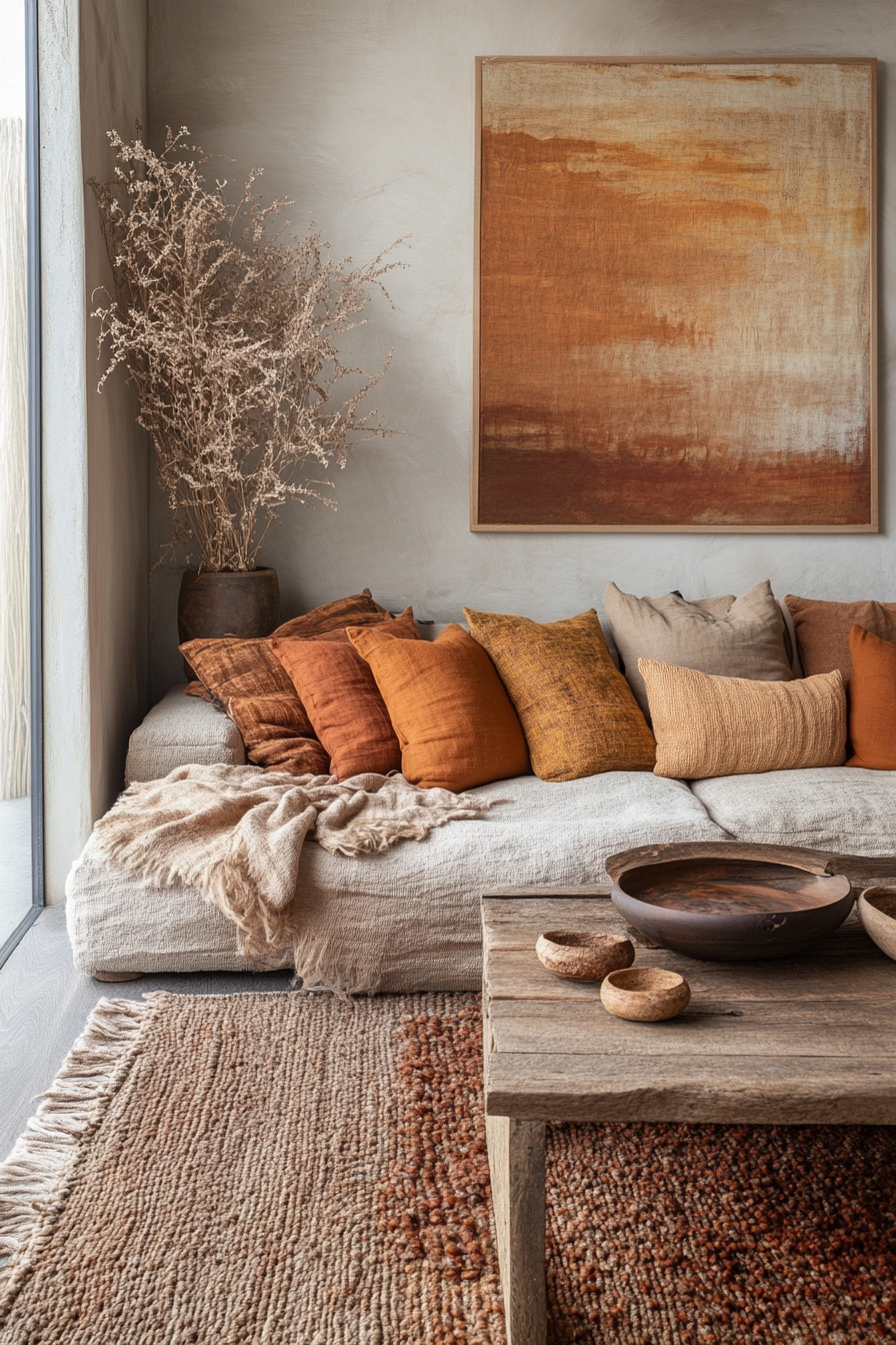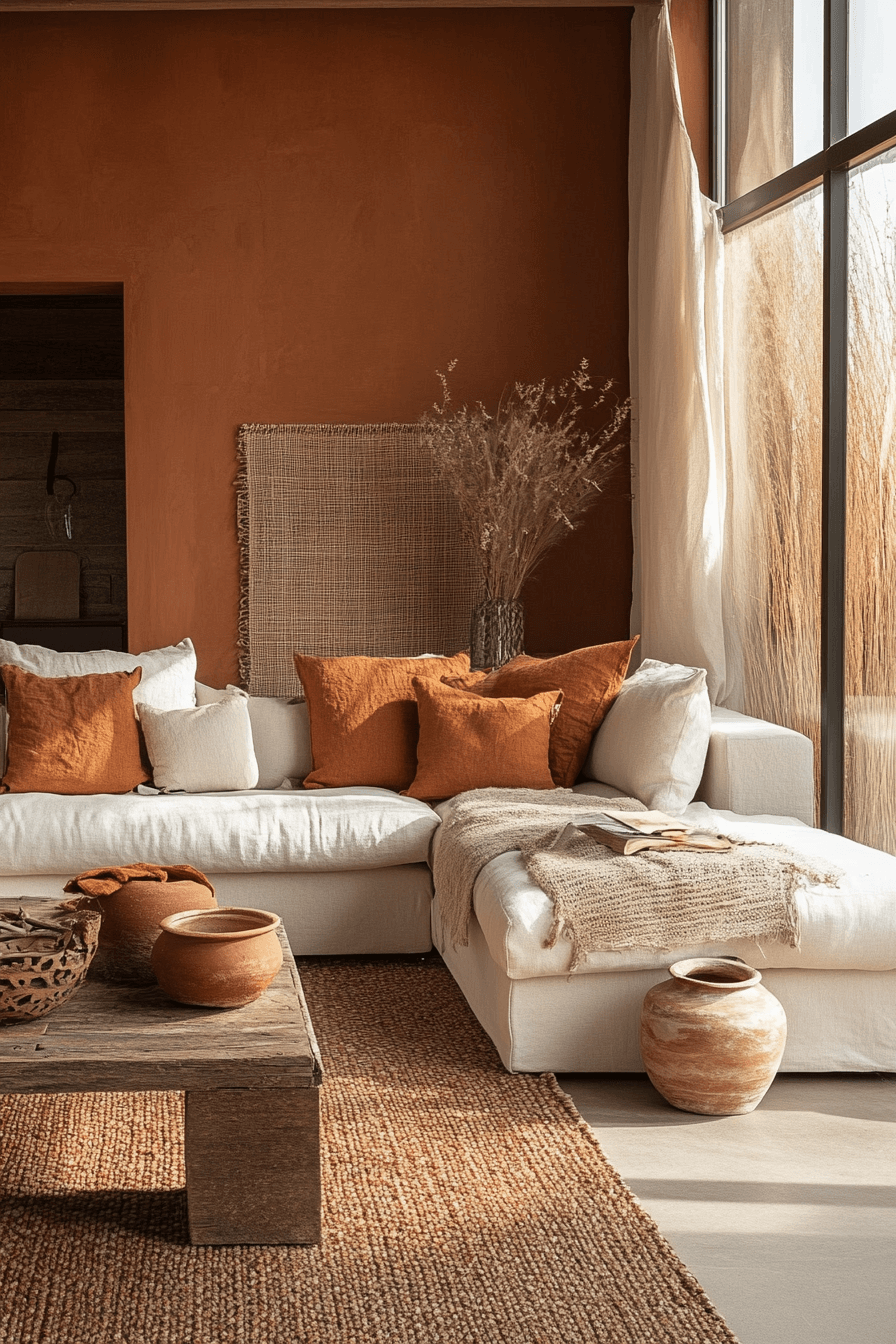Add richness with canyon calm—deep rust, warm clay, and muted tan tones. Curved furniture softens the palette. Layer textiles for comfort. The mood is cozy and grounded.