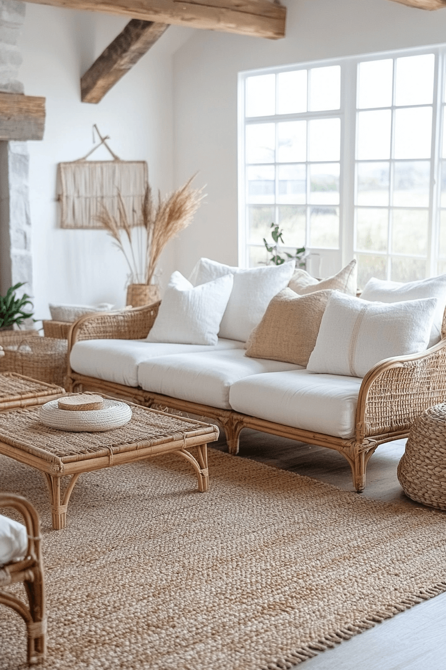 Ground your modern boho living room in soft sandy neutrals for a warm and calming backdrop. Light-toned woods and breathable fabrics create an airy feel. Woven accents add tactile depth without overpowering the look. Keep styling clean so the palette stays serene.