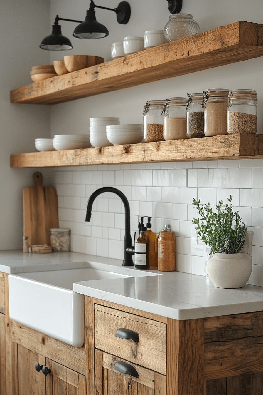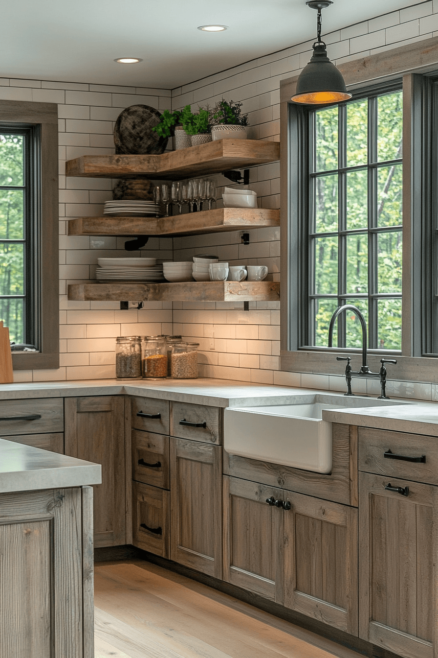 Open shelving paired with rustic kitchen cabinets creates a relaxed and functional design. It allows you to display dishes and decor with ease. The open layout makes the space feel larger and more inviting. Natural wood tones keep the look warm and cohesive. These rustic kitchen cabinets create a perfect mix of style and practicality. Explore more shelving ideas for your kitchen.
