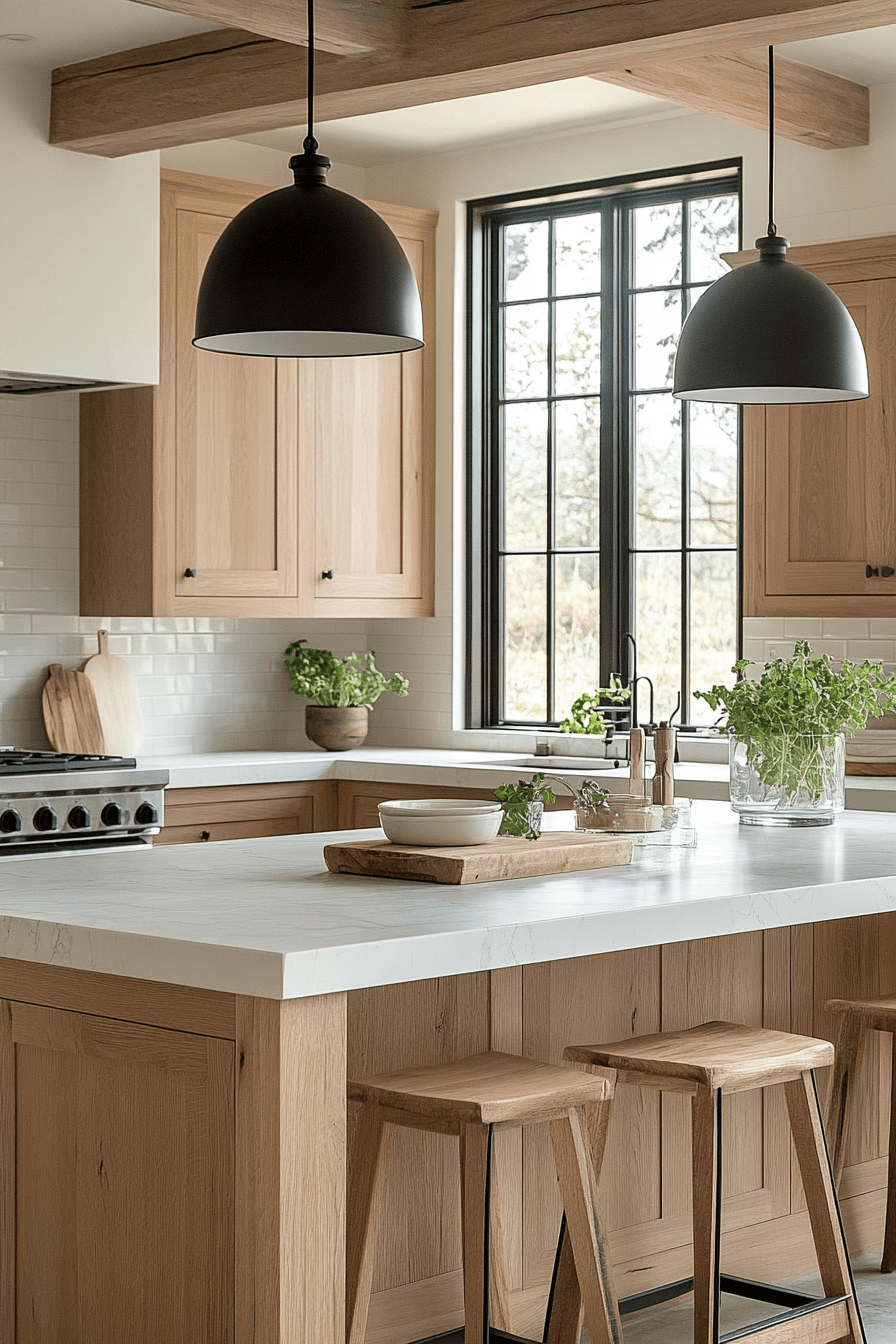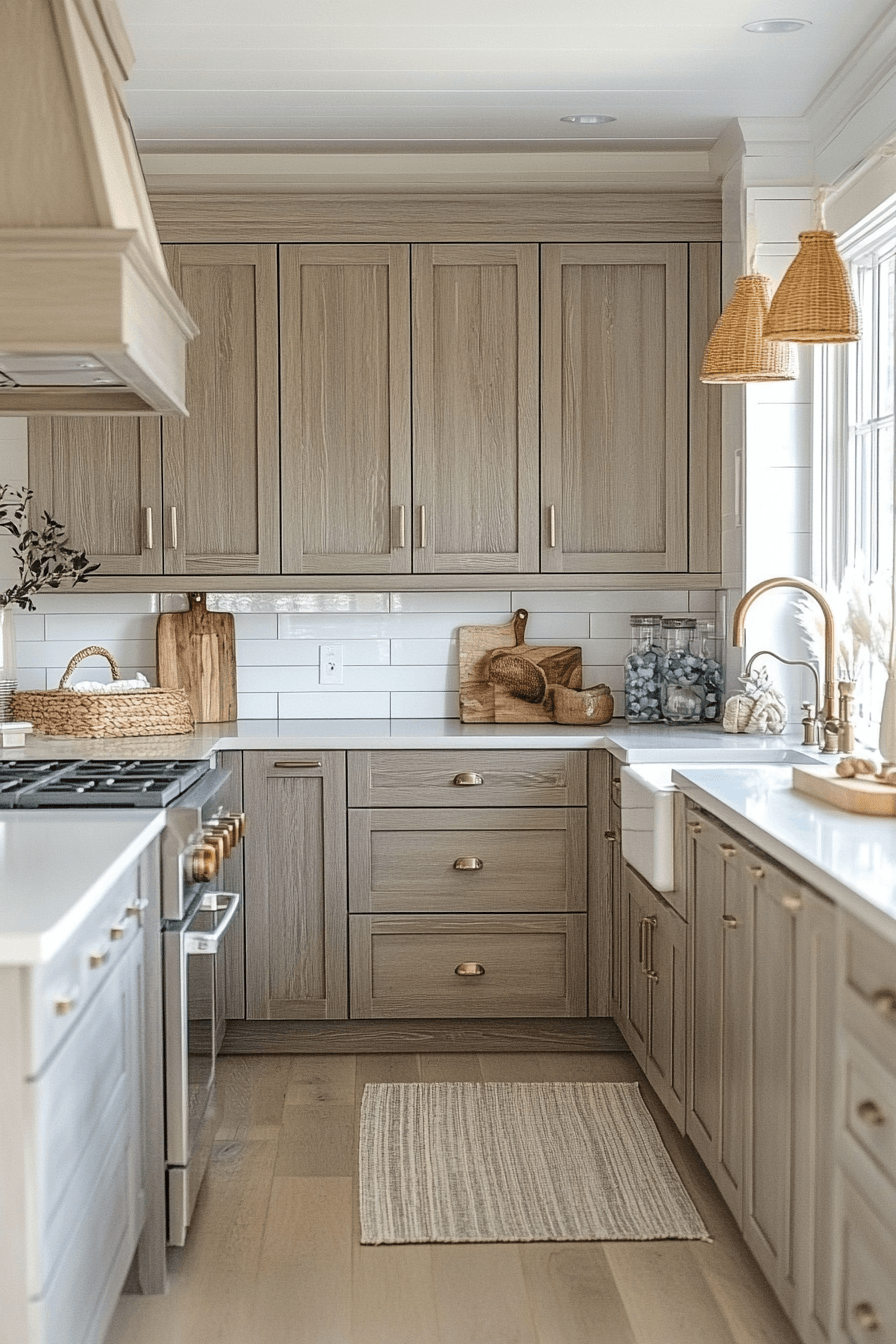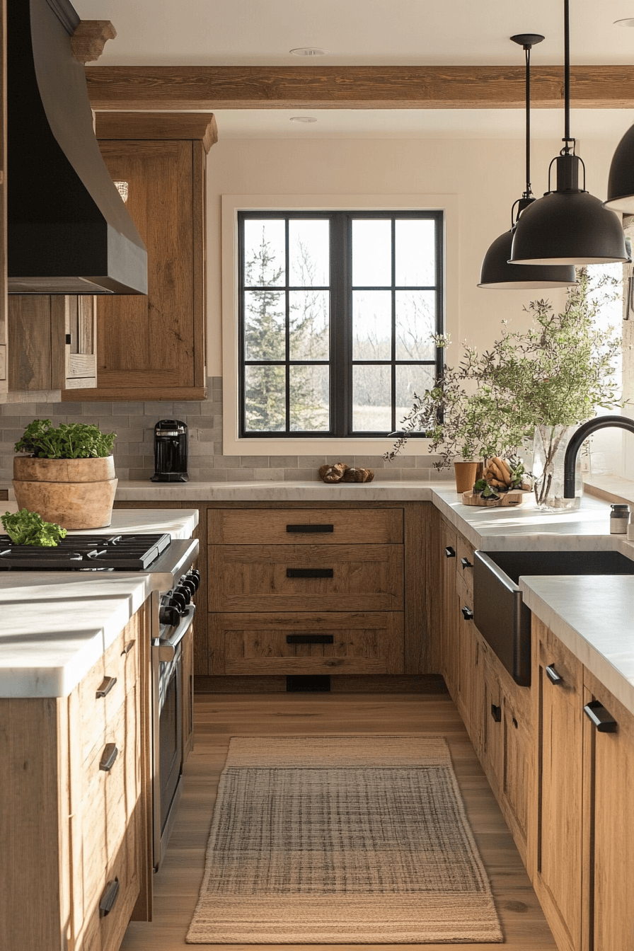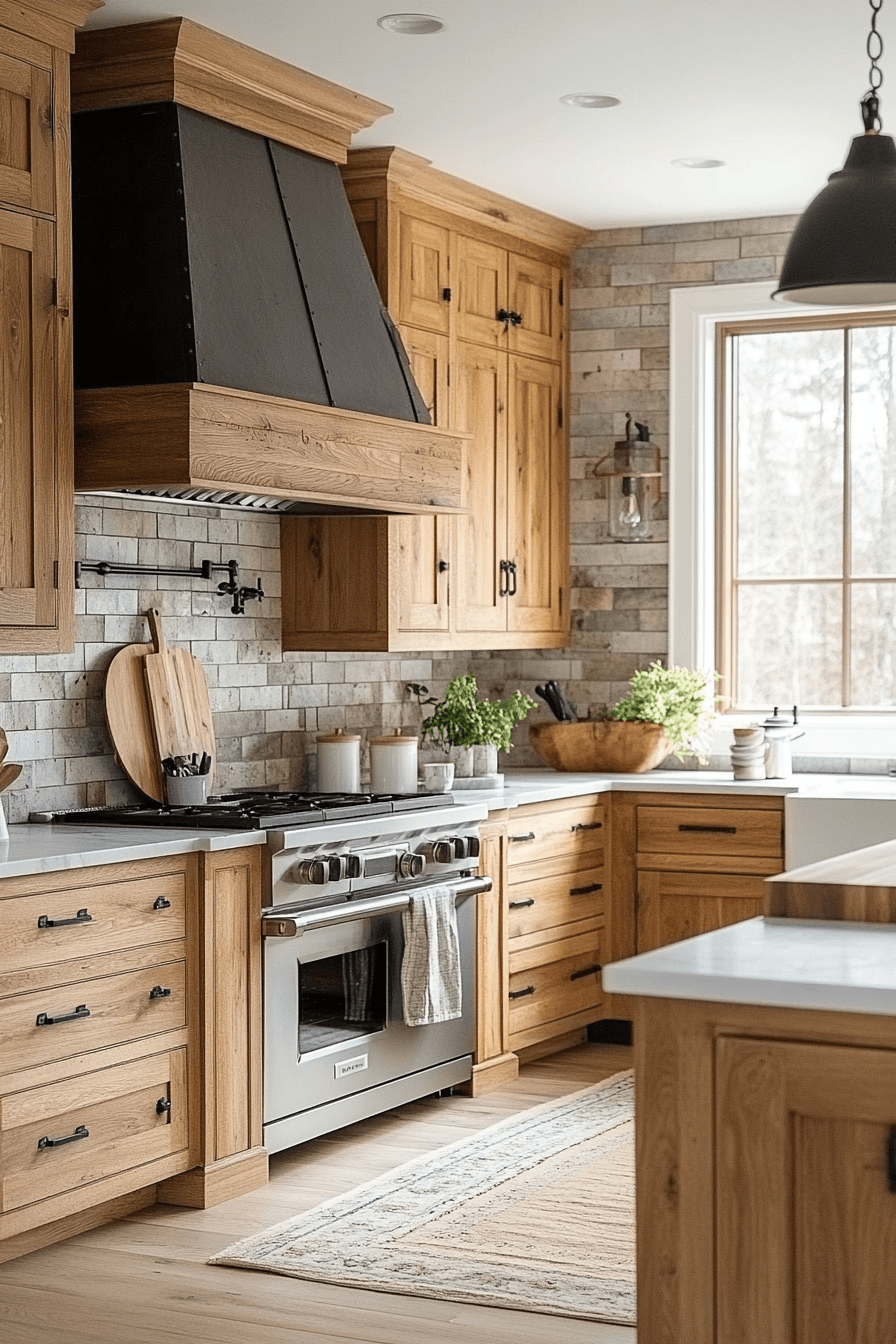 Soft oak finishes bring a fresh, airy touch to rustic kitchen cabinets. The lighter tones brighten the room while showcasing subtle wood grain details. This style pairs well with white surfaces and neutral accents. The result feels calm, open, and still rooted in rustic warmth. These rustic kitchen cabinets blend classic and modern elements beautifully. Discover more ways to use light wood in your kitchen.