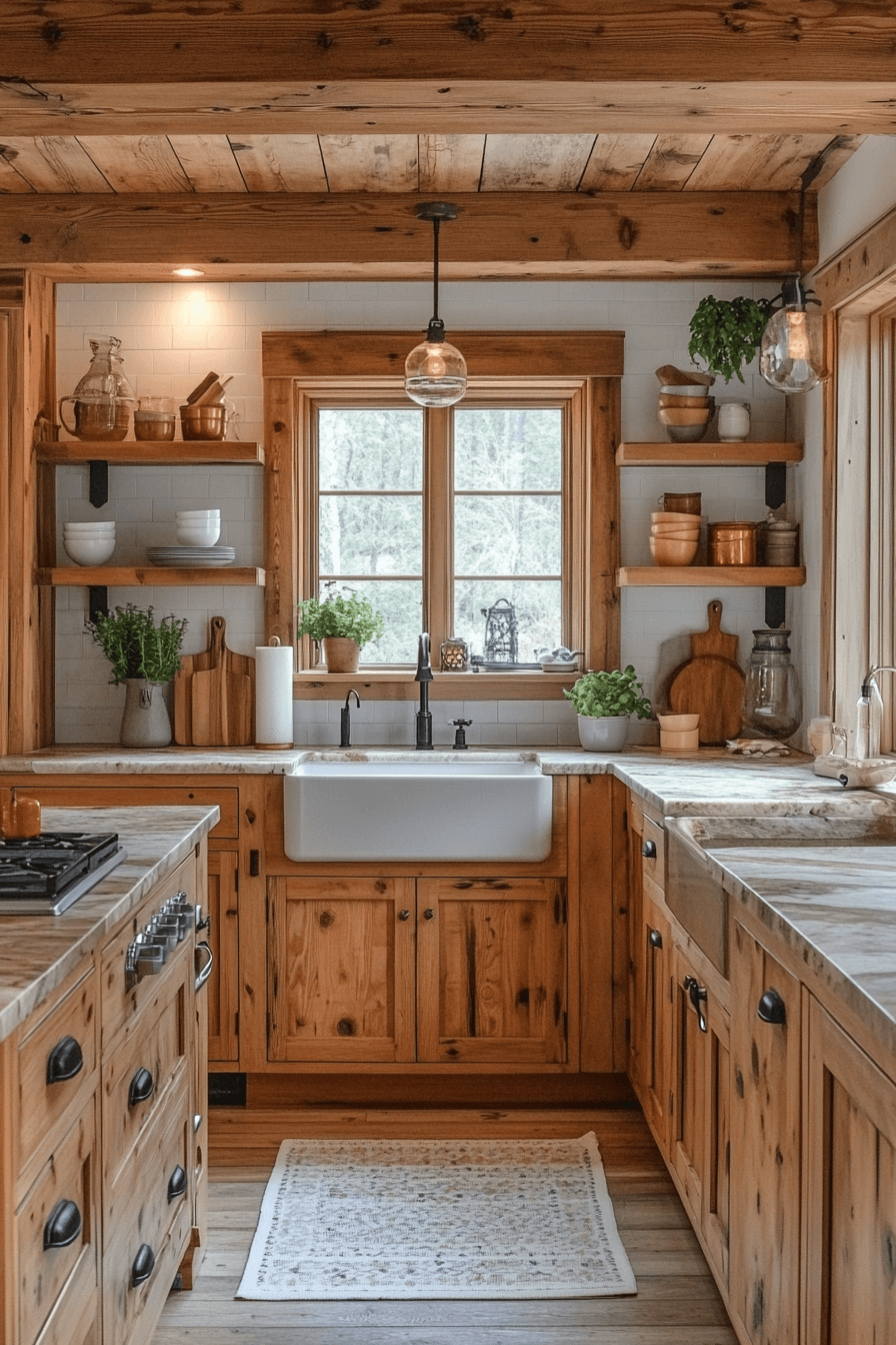 Pine wood cabinets bring warmth and texture to cozy rustic kitchen cabinets. Natural knots and variations create a rich, authentic look. Warm tones glow beautifully under soft lighting. Paired with stone or iron, the design feels balanced and inviting. These rustic kitchen cabinets highlight the beauty of natural wood. Discover more pine-inspired kitchen ideas.