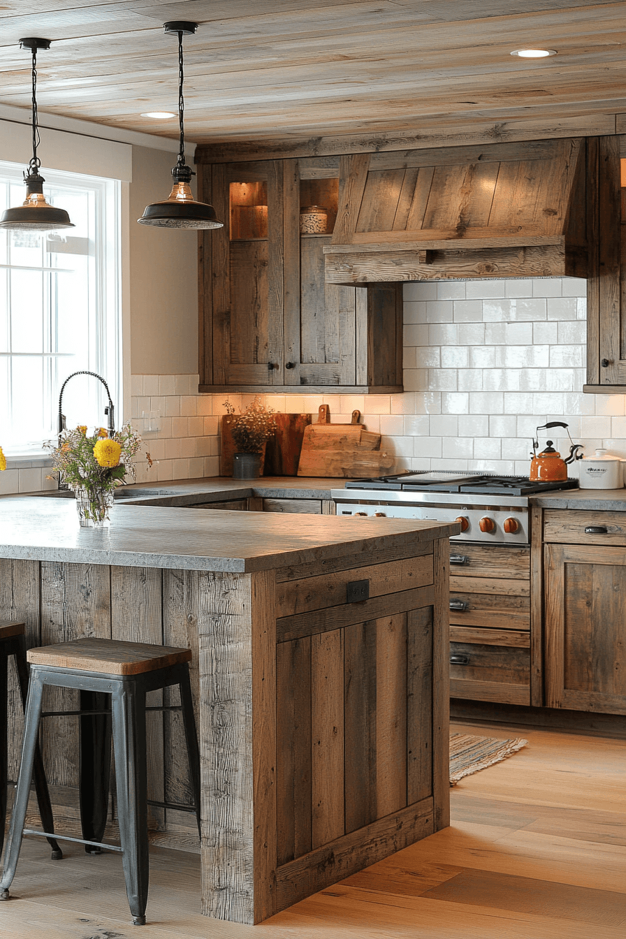 Salvaged wood adds depth and history to unique rustic kitchen cabinets. Each piece carries natural imperfections like knots, cracks, and weathered edges. These details create a rich, story-filled aesthetic that feels authentic. The aged wood pairs beautifully with modern appliances for contrast. These rustic kitchen cabinets bring character and sustainability into your kitchen. Discover more reclaimed wood inspiration for your space.