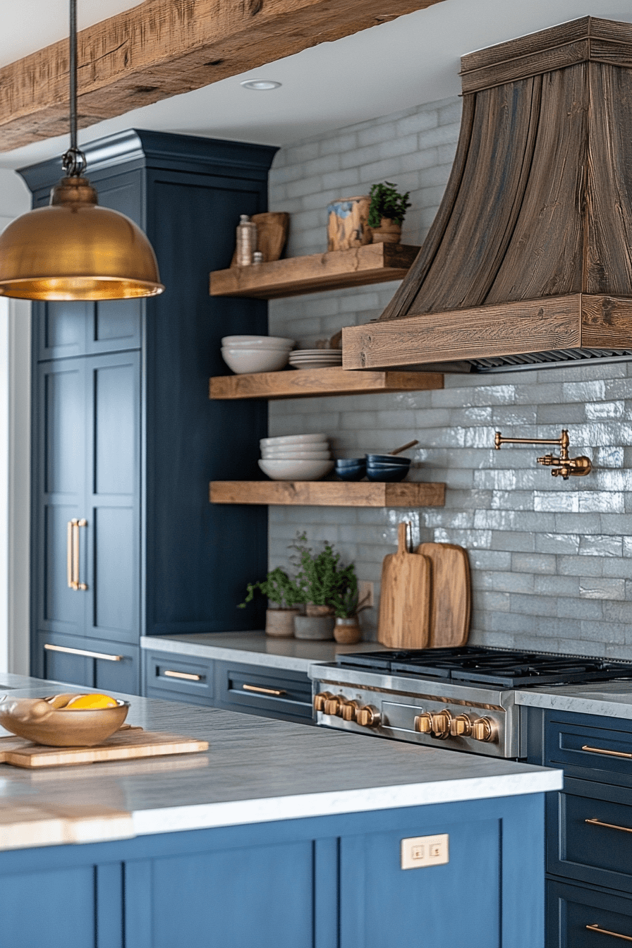 Muted blue tones add a refreshing twist to rustic kitchen cabinets. Soft shades bring color without overpowering the design. Paired with wood and warm metals, the look stays balanced. The result feels calm and welcoming. These rustic kitchen cabinets blend color with natural warmth beautifully. Explore more blue cabinet ideas.