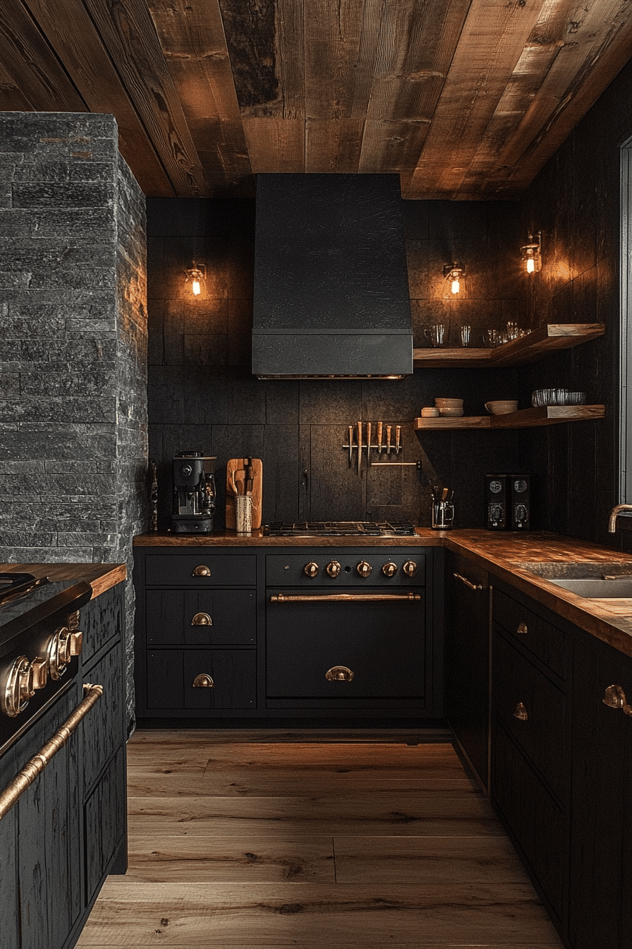 Burnt wood finishes create bold contrast in rustic kitchen cabinets. The dark tones enhance the grain and texture of the wood. This technique adds depth and visual impact. Paired with lighter elements, the look feels modern and rustic. These rustic kitchen cabinets make a striking statement. Discover more bold wood finishes.