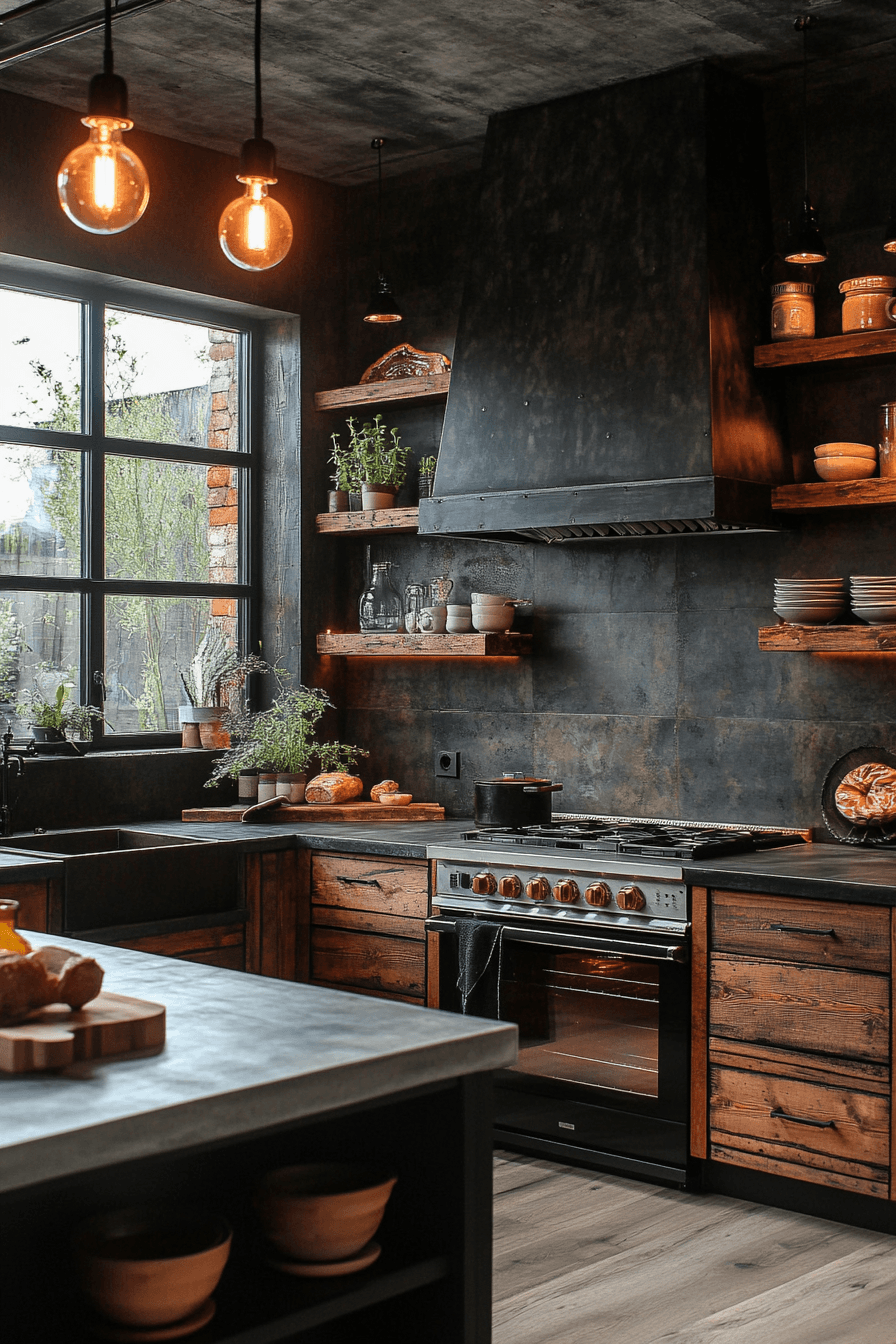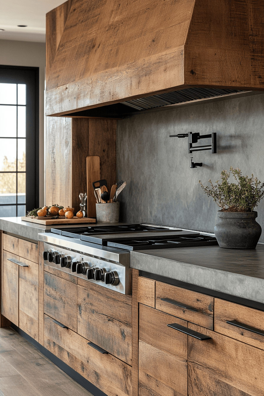 Combining wood with industrial elements enhances rustic kitchen cabinets. Metal and concrete add contrast and structure. The warmth of wood softens the harder materials. This creates a balanced and stylish design. These rustic kitchen cabinets anchor the space beautifully. Explore more rustic-industrial kitchen ideas.