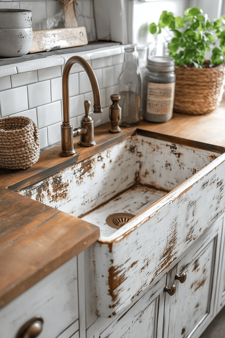 A distressed white finish brightens rustic kitchen cabinets while keeping vintage charm. The worn paint reveals wood beneath for texture. This layered look feels timeless and inviting. Paired with dark accents, the design stays balanced. These rustic kitchen cabinets feel light yet warm. Discover more distressed styles.