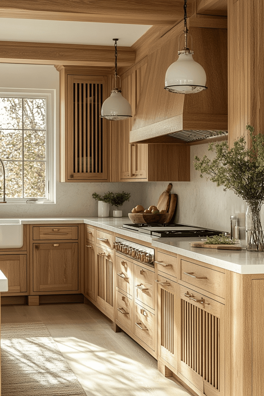 Slatted cabinet fronts add subtle texture to rustic kitchen cabinets. The linear design creates movement and depth. Natural wood tones highlight the pattern beautifully. This feature blends modern and rustic styles. These rustic kitchen cabinets feel structured yet organic. Discover more slatted designs.