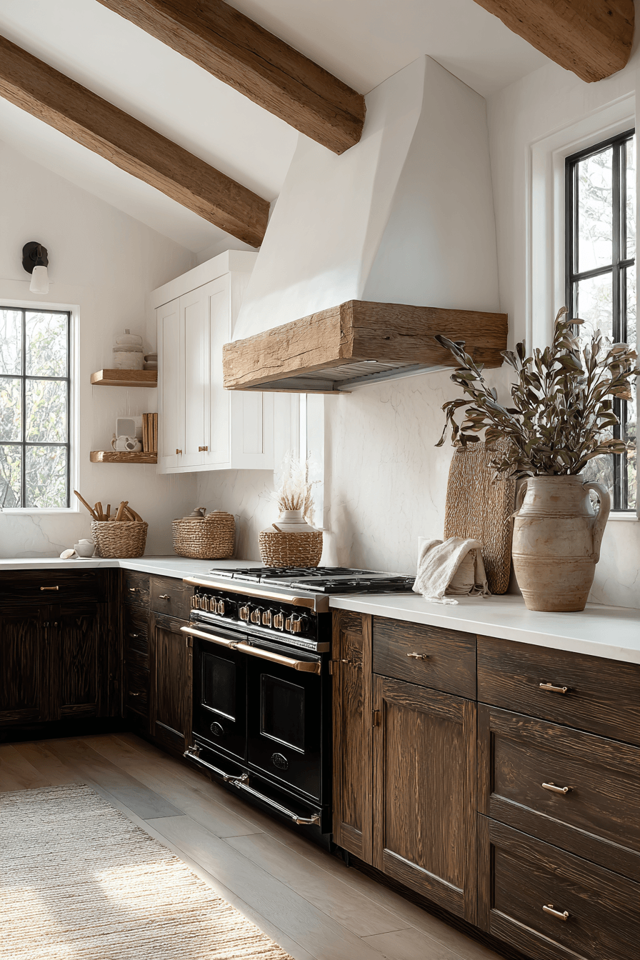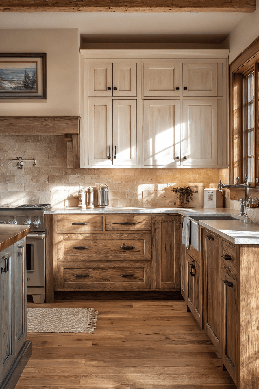 Mixing wood tones creates visual interest in rustic kitchen cabinets. Light and dark finishes add contrast and dimension. This layered approach keeps the design dynamic. It also highlights key features in the space. These rustic kitchen cabinets feel curated and inviting. Explore more mixed wood ideas.