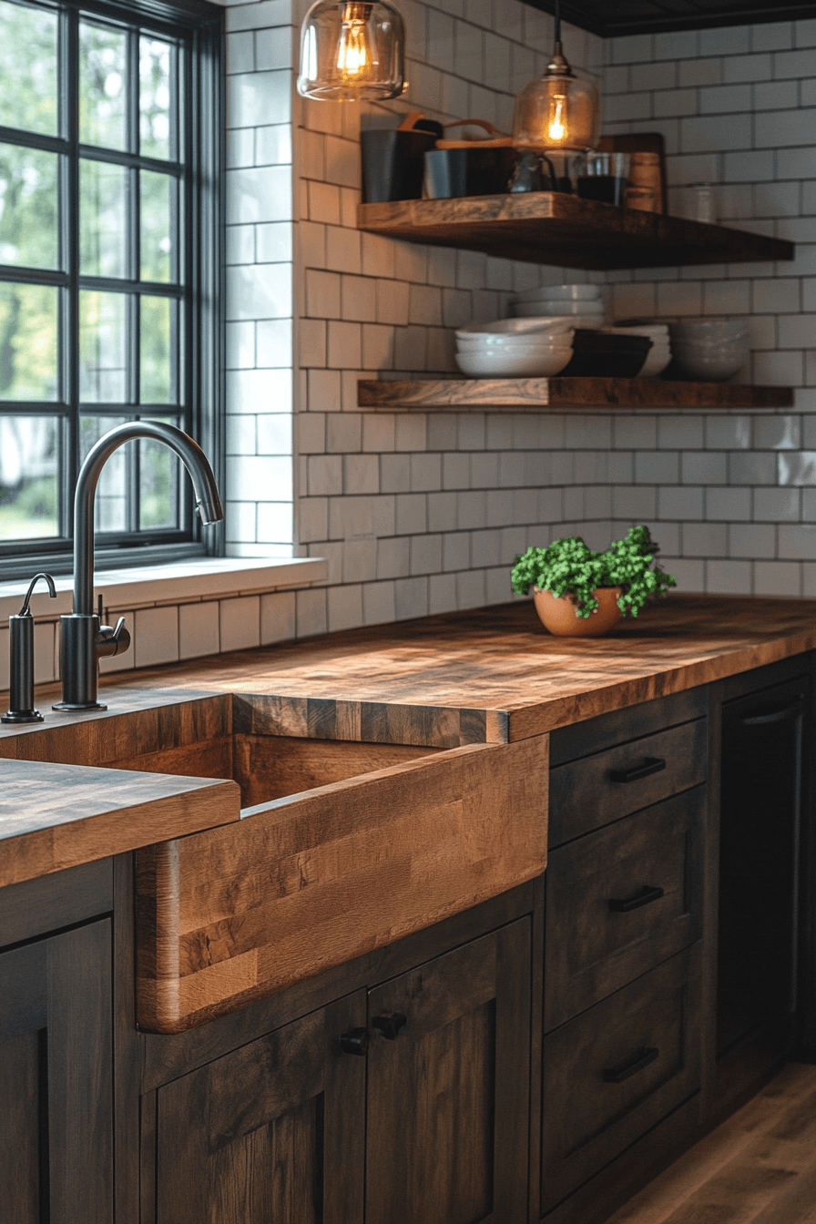Butcher block adds warmth and function to rustic kitchen cabinets. Thick wood surfaces showcase rich grain patterns. The material is both practical and beautiful. It enhances the cozy feel of the kitchen. These rustic kitchen cabinets create a welcoming workspace. Discover more butcher block inspiration.