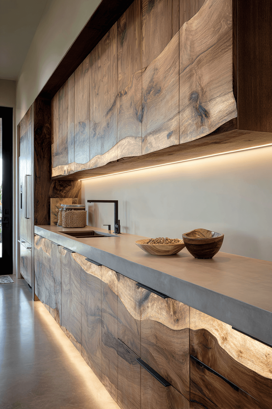 Cabinets designed with organic wood edges add a handcrafted feel to rustic kitchen cabinets. The natural contours create a raw and artistic appearance. This design highlights the beauty of the wood in its most natural form. It pairs effortlessly with clean, simple interiors for balance. These rustic kitchen cabinets feel like functional works of art. Explore more natural-edge designs for your kitchen.