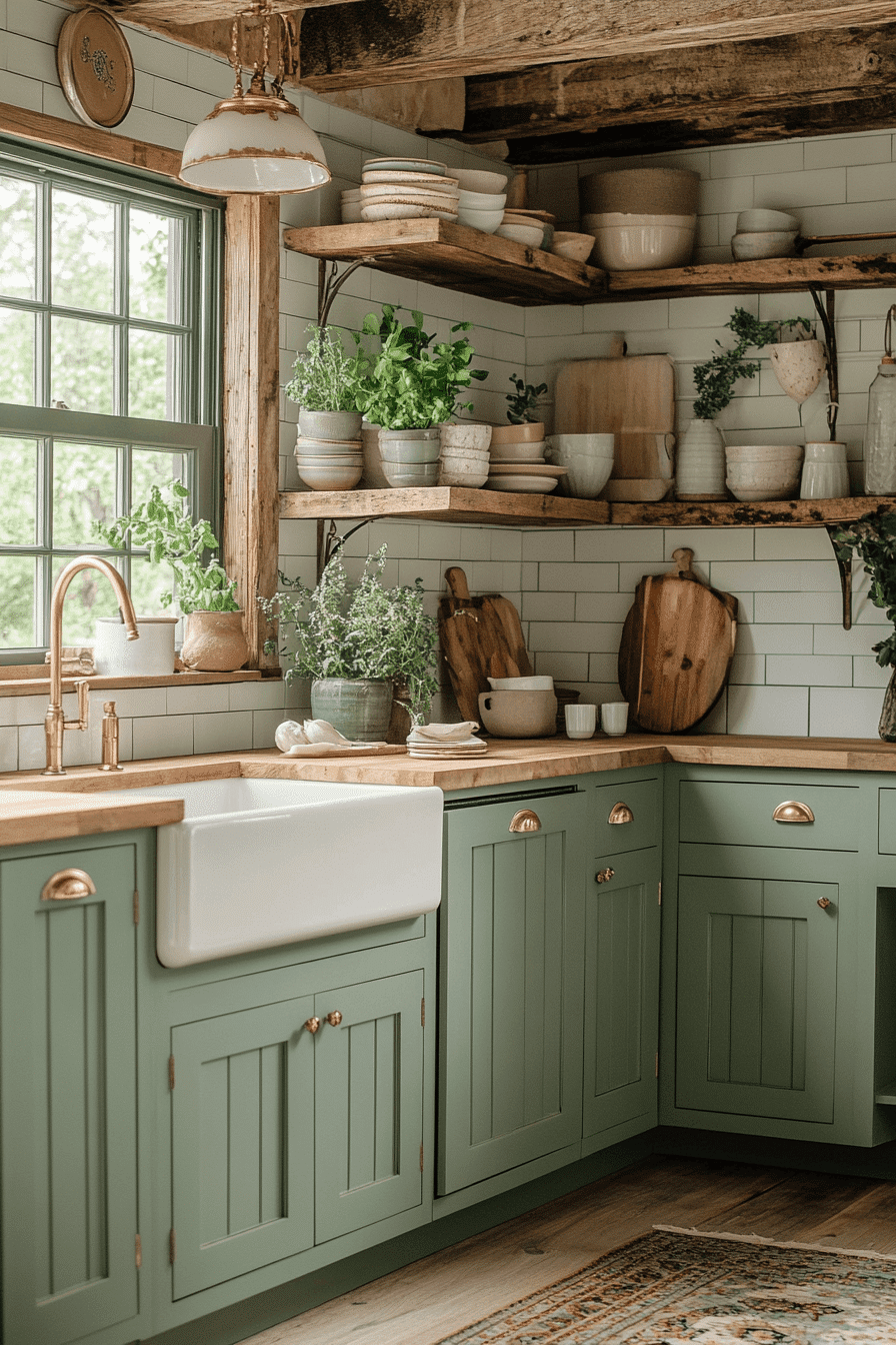 Earthy green finishes bring a natural and calming feel to rustic kitchen cabinets. Shades like sage and moss complement wood textures effortlessly. This palette creates a connection to nature while adding color. Paired with stone or brass, the look feels warm and grounded. These rustic kitchen cabinets create a peaceful, inviting environment. Discover more green-inspired kitchen designs.