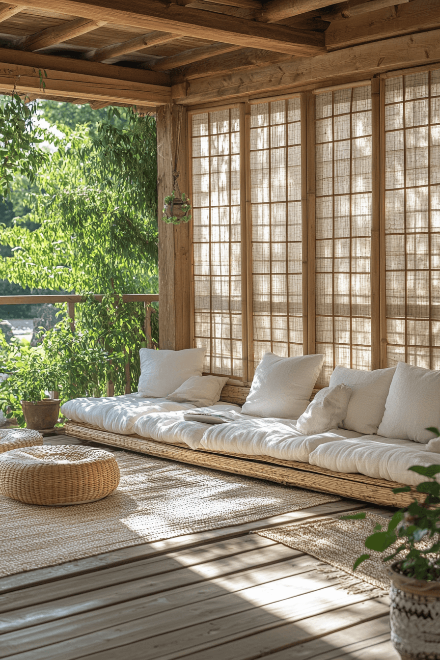 A porch inspired by Scandinavian Japanese interior principles becomes a breath of fresh air. Shoji panels filter light gracefully, casting a warm, golden glow. Minimal décor and wood tones connect the indoors to the outdoors with ease. The peaceful atmosphere invites quiet mornings and mindful evenings.