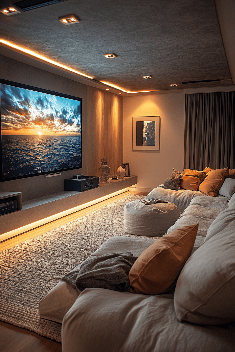 This media room redefines entertainment with a refined Scandinavian Japanese interior aesthetic. Natural wood accents and sleek, modern finishes blend relaxation with innovation. Neutral tones keep the space grounded while promoting serenity. Subtle lighting enhances focus and mood for effortless enjoyment.