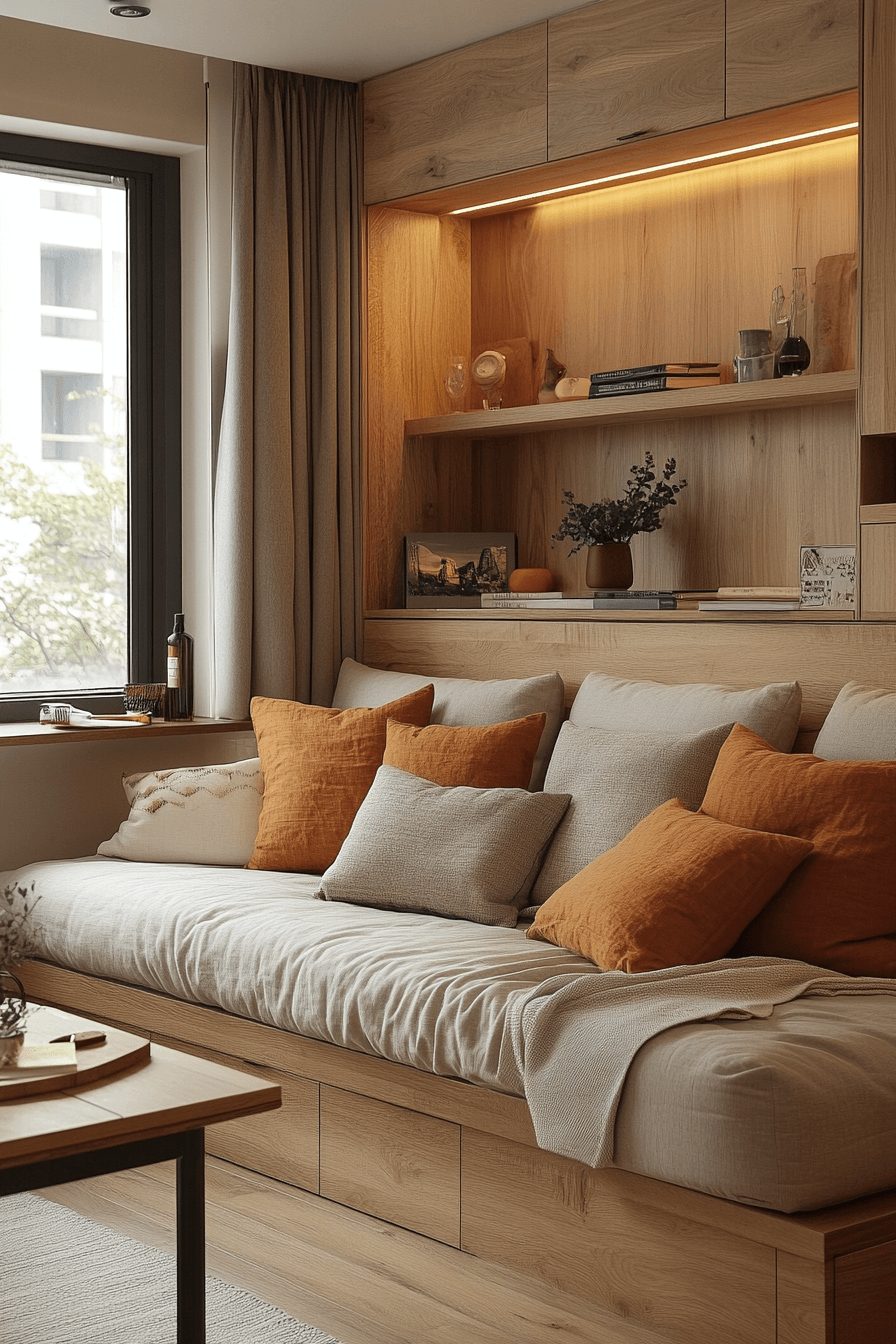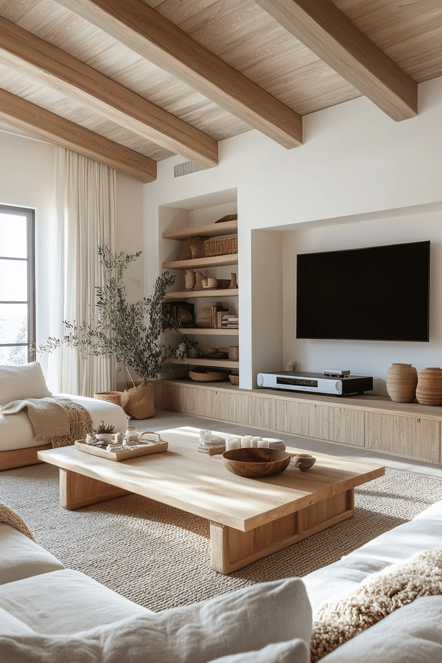 In this living room, a Scandinavian Japanese interior aesthetic transforms minimalism into pure comfort. Natural wood furniture and cozy linen textures create a tranquil flow that feels both fresh and grounding. Neutral tones highlight the simplicity of the space, while soft lighting sets the mood for relaxation. Every element encourages slow living and mindful moments.