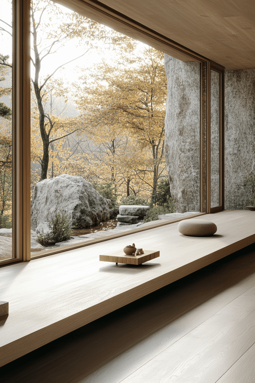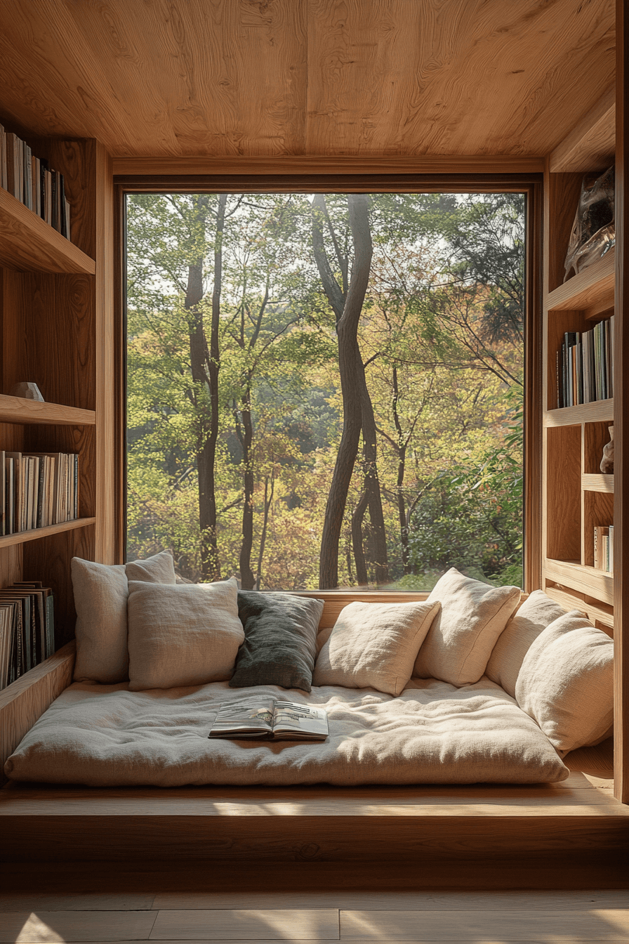 A reading nook styled with a Scandinavian Japanese interior aesthetic offers a personal escape from the world. Plush floor cushions, soft fabrics, and gentle lighting create cozy stillness. The natural tones promote calm reflection and mindful rest. Simplicity makes it both beautiful and soothing.