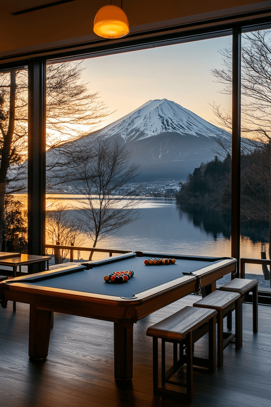 This game room balances playfulness and calm using Scandinavian Japanese interior harmony. Natural materials and clean lines maintain order while inviting fun. Muted colors and balanced lighting enhance focus and enjoyment. Every design choice adds both comfort and sophistication.