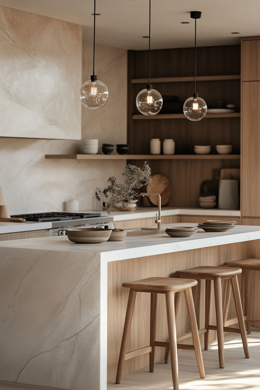 This kitchen glows with effortless beauty inspired by a Scandinavian Japanese interior, balancing function and elegance in perfect harmony. Light oak cabinetry, soft stone surfaces, and thoughtful organization make every corner feel calm and purposeful. The design celebrates simplicity while exuding warmth and sophistication. Natural textures and muted tones create an inviting place to cook and gather.