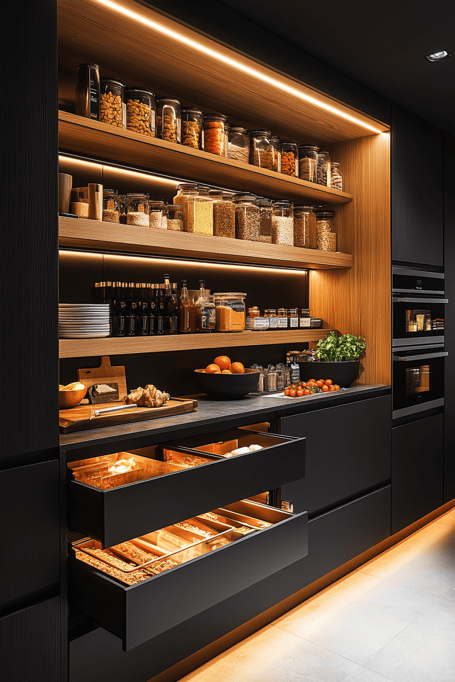 The pantry becomes a sanctuary of order with a Scandinavian Japanese interior approach. Streamlined shelving and light wood tones bring elegance to organization. The neutral color palette enhances clarity and focus. Everything feels intentional and visually calming.