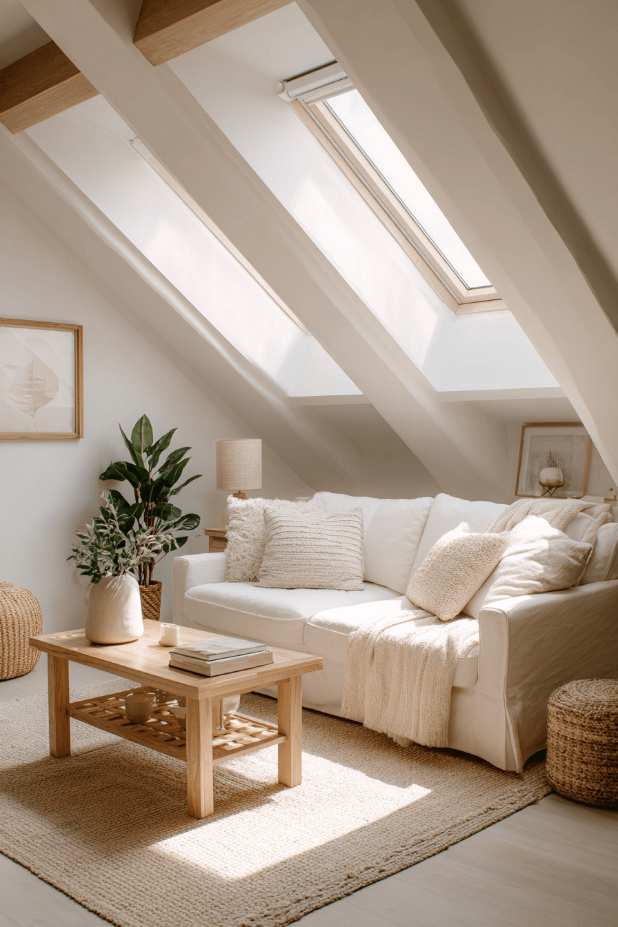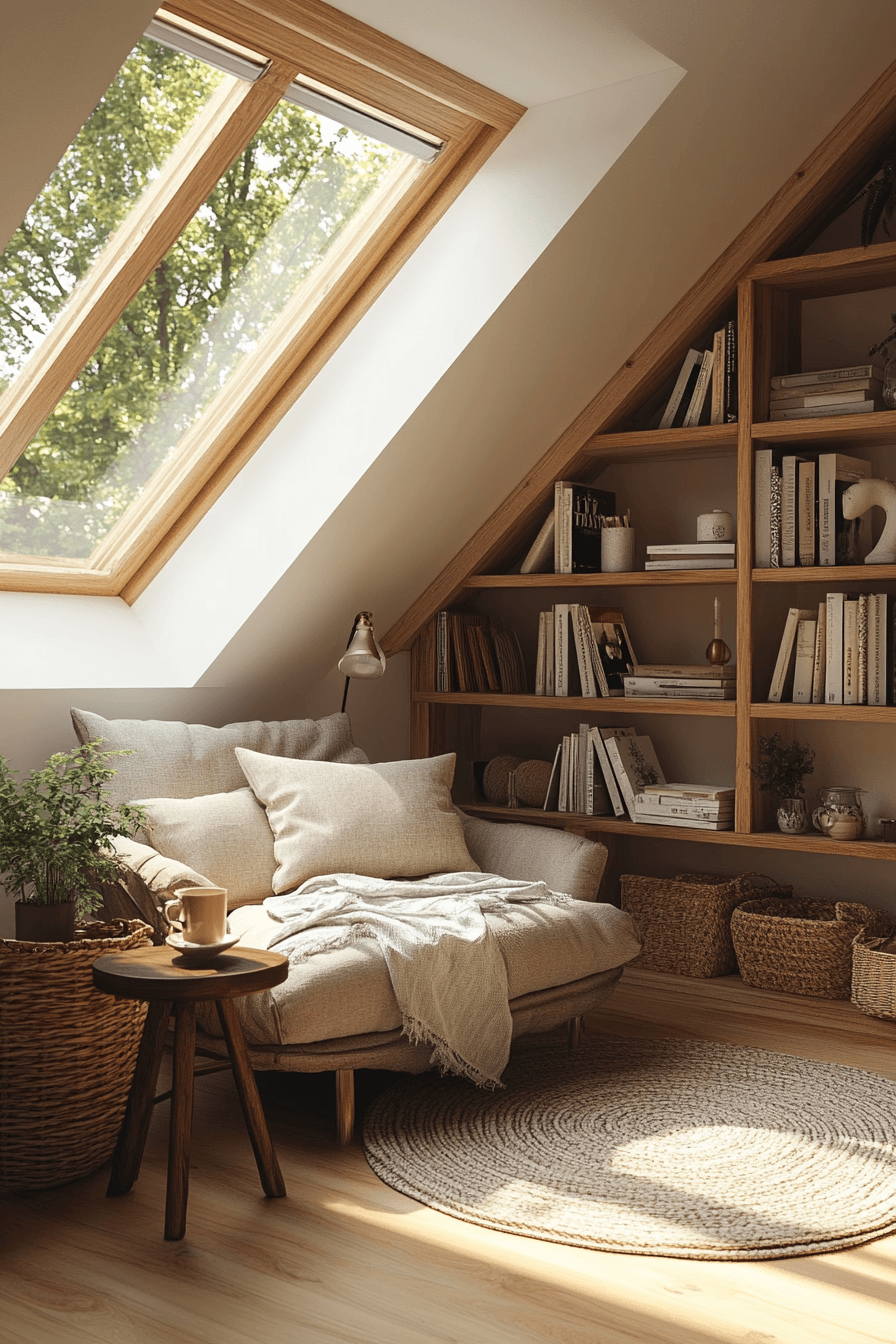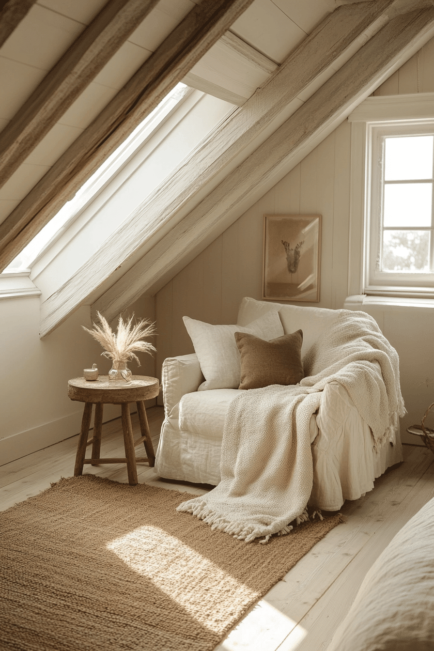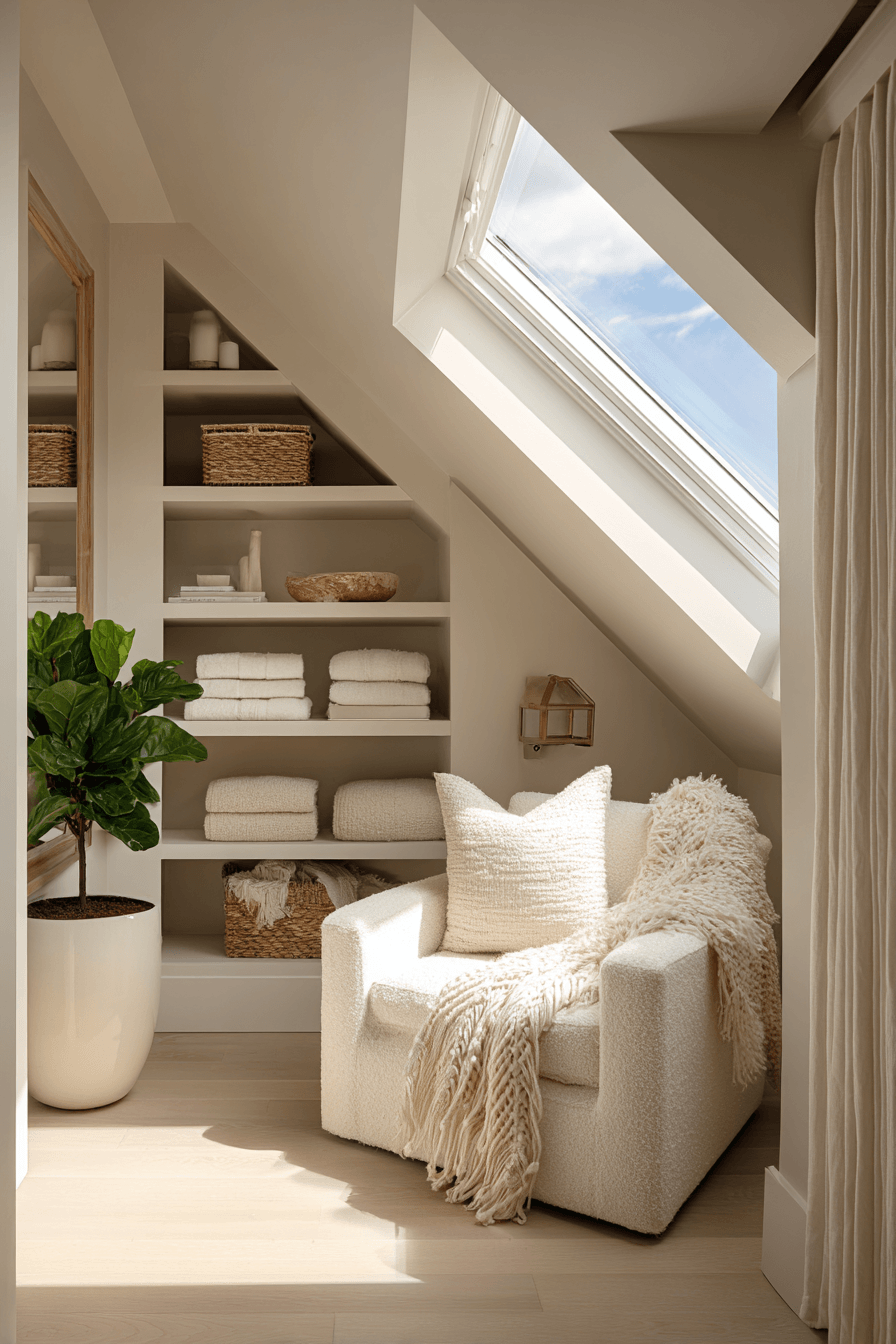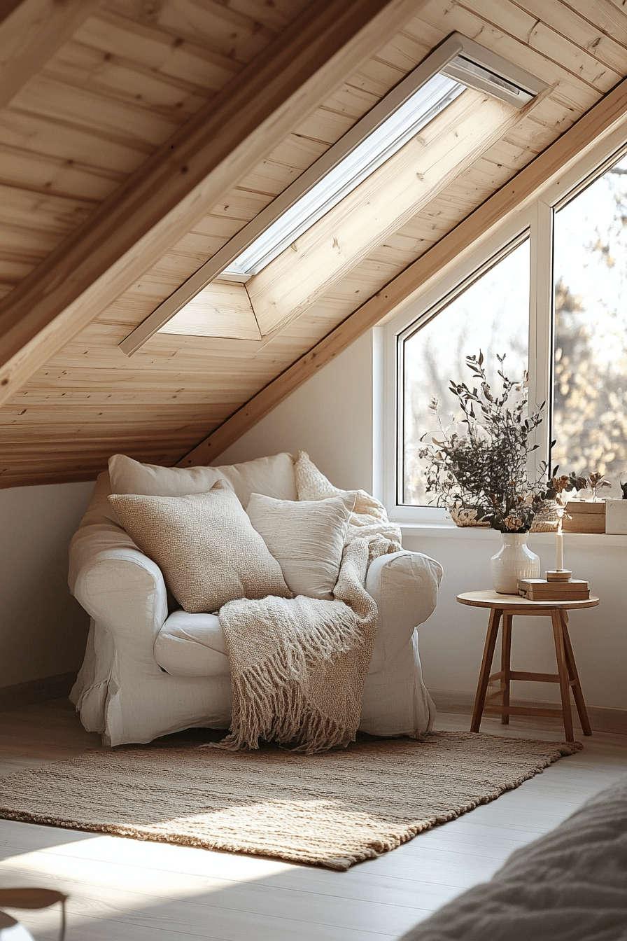 Sunlight streaming from above can completely transform tight spaces, and small attic room ideas like a skylight corner make everything feel brighter and more open. Natural light softens the angles of the ceiling and adds a fresh, uplifting vibe. A cozy chair layered with cushions creates the perfect place to relax. Light wood tones and warm neutrals keep the space airy yet inviting. Compact furniture keeps things functional without crowding the room. Tap to explore more small attic room ideas that feel bright and uplifting.
