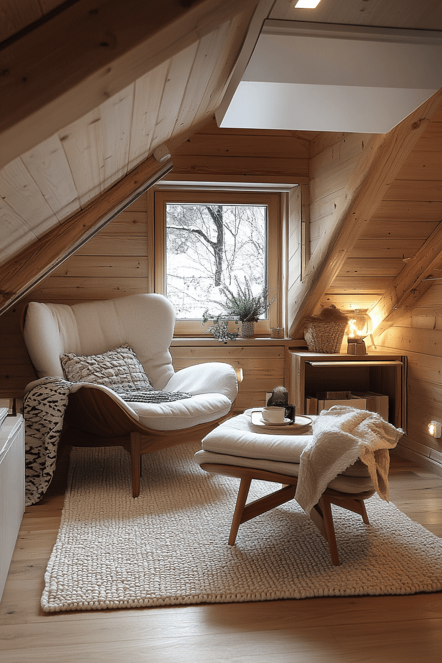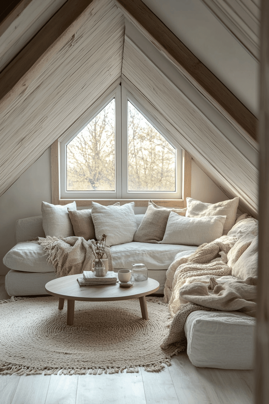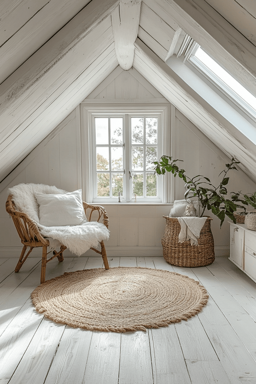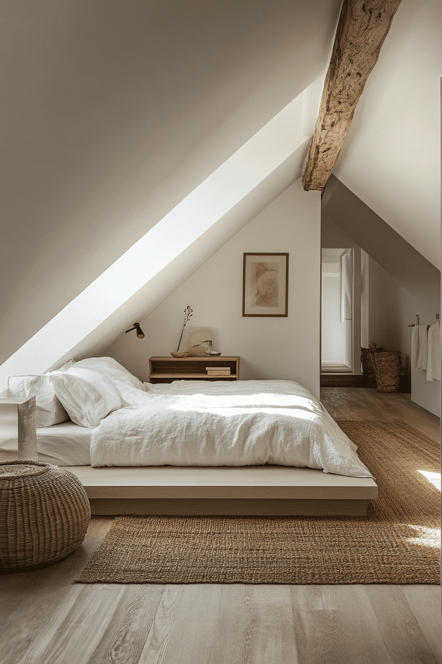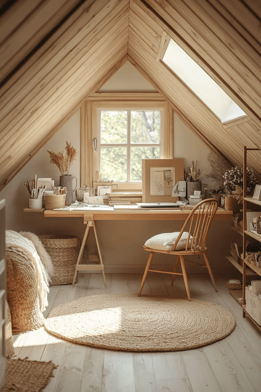 Scandinavian-inspired styling brings lightness and simplicity into small attic room ideas with a clean, airy feel. Pale wood finishes and soft white tones reflect light beautifully. Minimal furniture keeps the space open and uncluttered. Cozy layers add warmth without overwhelming the design. The result feels calm, modern, and inviting. Tap to discover more small attic room ideas with Nordic charm.