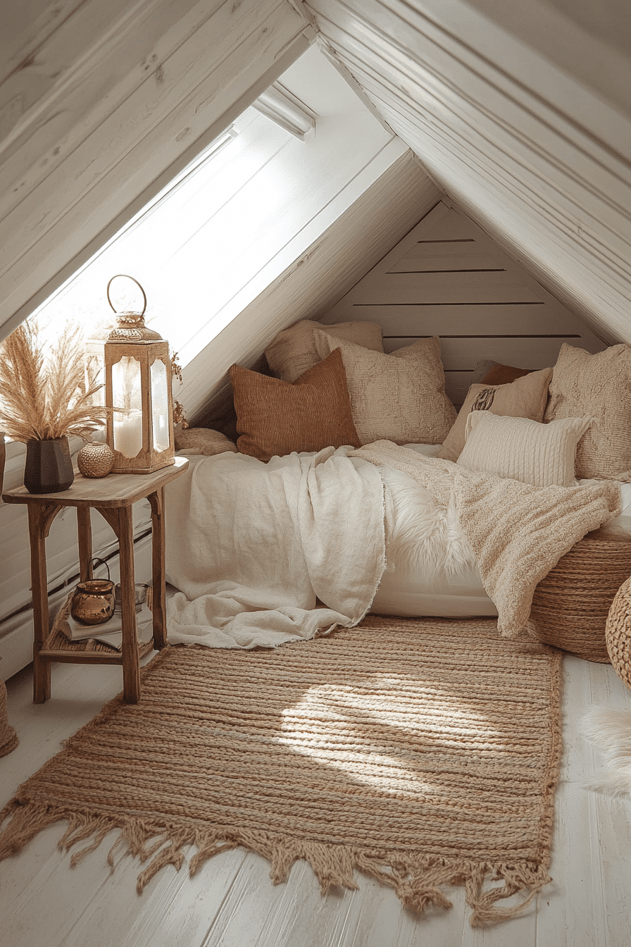 A relaxed boho touch brings warmth and personality into small attic room ideas with layered textures and cozy details. Floor cushions and rugs create a comfortable setup. Natural materials enhance the inviting feel. Soft tones keep the design cohesive. Low seating works perfectly with sloped ceilings. Explore more small attic room ideas with boho charm.