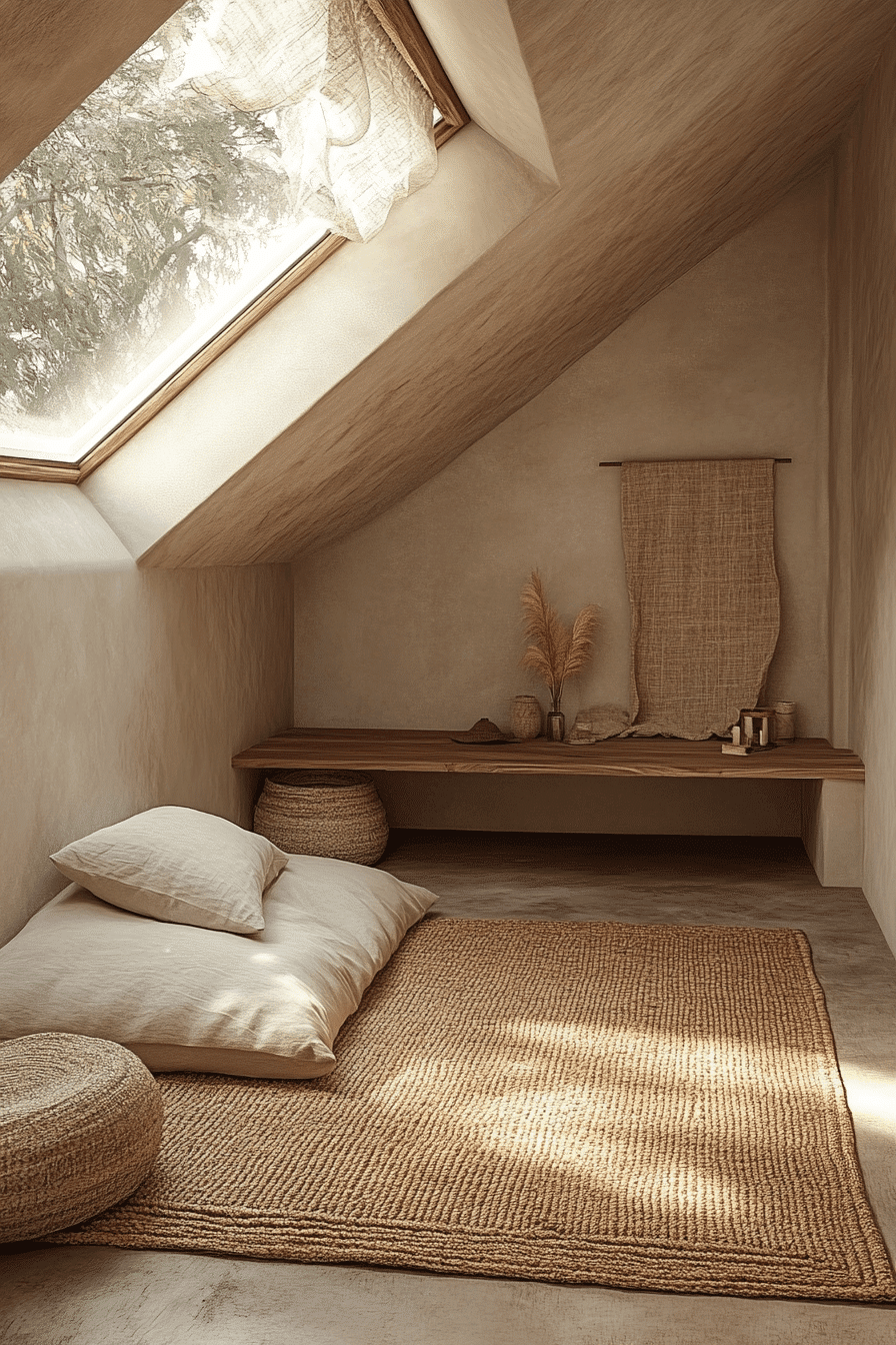 Designing a quiet retreat becomes effortless with small attic room ideas focused on calm and mindfulness. Soft lighting and minimal decor create a peaceful atmosphere. Floor seating encourages relaxation. Natural textures ground the space beautifully. Muted tones enhance serenity. Discover more small attic room ideas for peaceful escapes.
