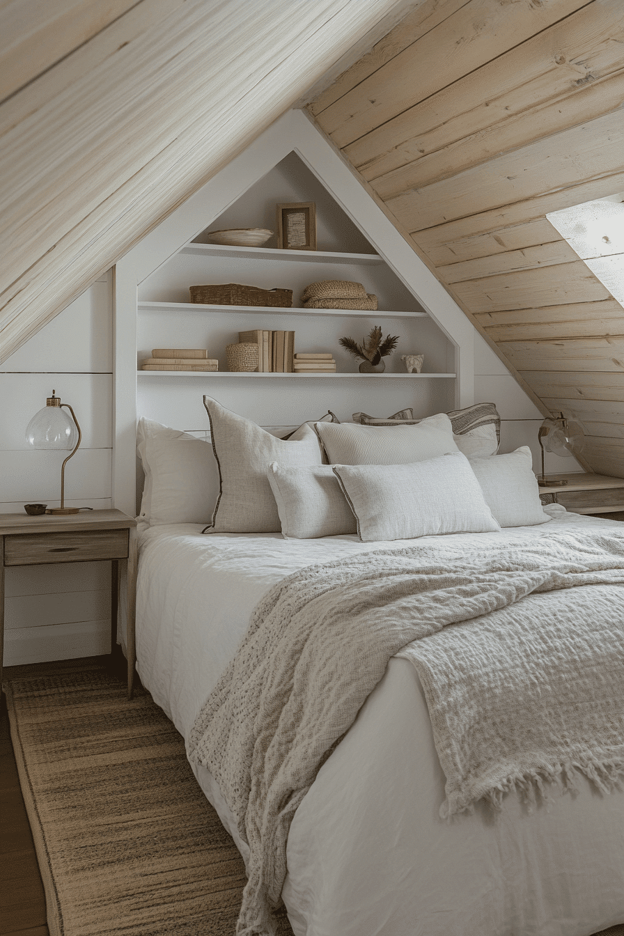All-white styling can instantly open up small attic room ideas by reflecting light and enhancing the sense of space. Bright surfaces make the room feel larger and more airy. Minimal decor highlights the architecture beautifully. Warm textures prevent the space from feeling too stark. Soft lighting balances everything out. Discover more small attic room ideas that feel light and open.