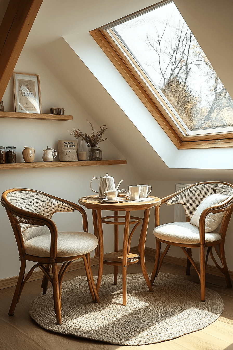 A cozy coffee corner adds charm to small attic room ideas by creating a relaxing spot for quiet moments. A small table and chair fit perfectly into tight layouts. Natural light enhances the atmosphere. Soft textures add warmth and comfort. Minimal decor keeps the space uncluttered. Explore more small attic room ideas for cozy corners.