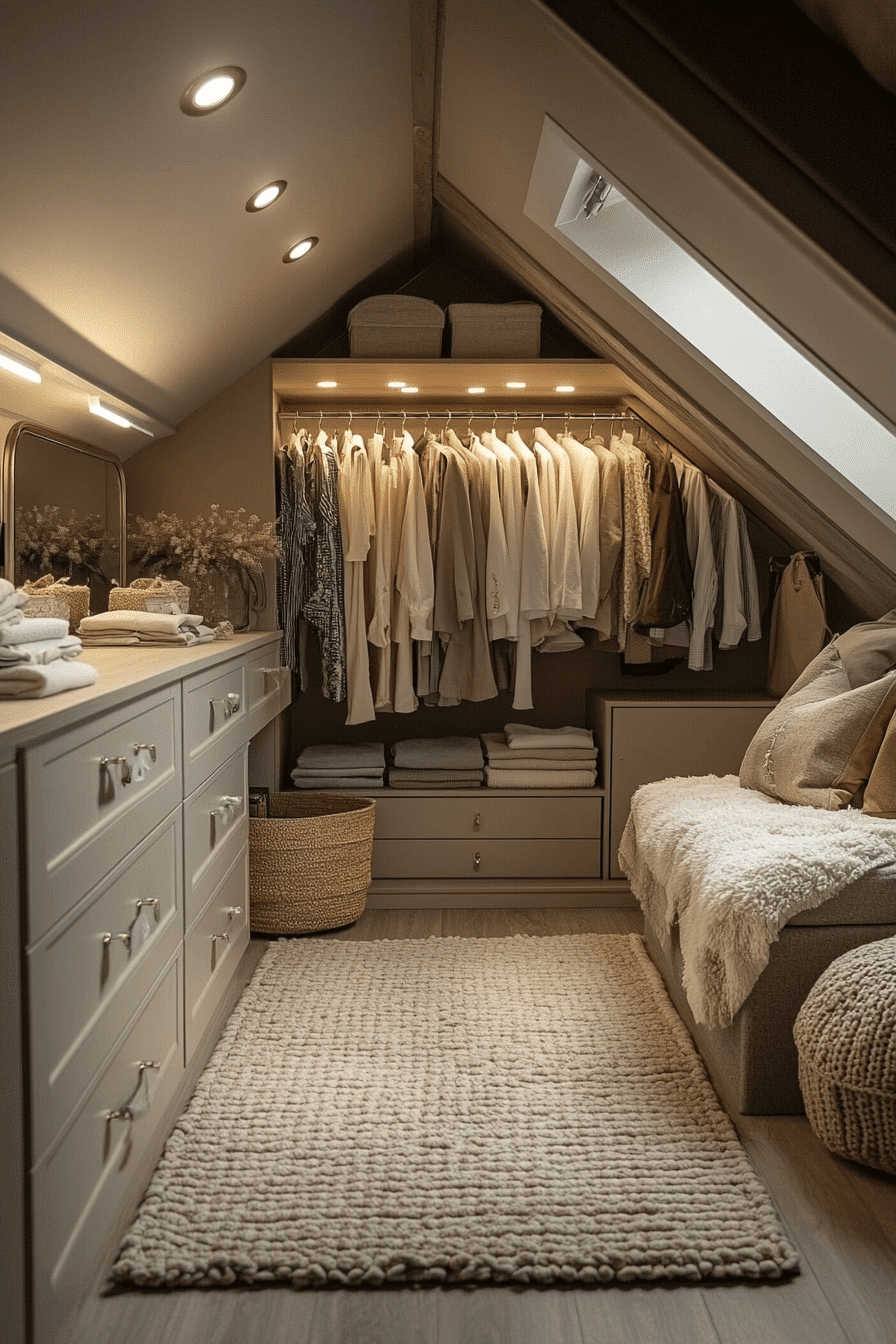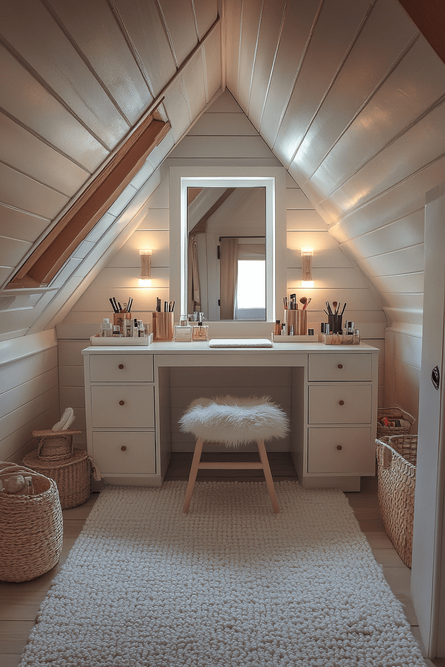 A stylish dressing area can elevate small attic room ideas by turning unused space into something functional and elegant. Low storage fits perfectly under sloped ceilings. Mirrors enhance light and openness. Soft lighting creates a boutique feel. Organized layouts keep everything neat. Explore more small attic room ideas for dressing spaces.