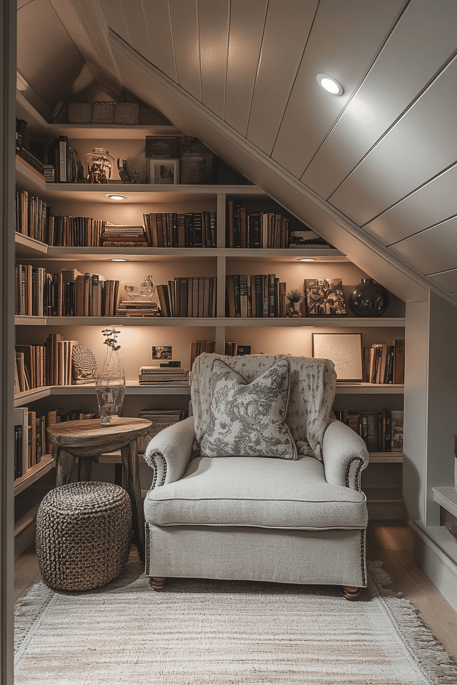 A cozy reading loft adds charm to small attic room ideas by creating a peaceful escape filled with warmth. Built-in shelves maximize storage. A comfortable chair invites relaxation. Soft lighting enhances the atmosphere. Light tones keep the space open. Discover more small attic room ideas for book lovers.