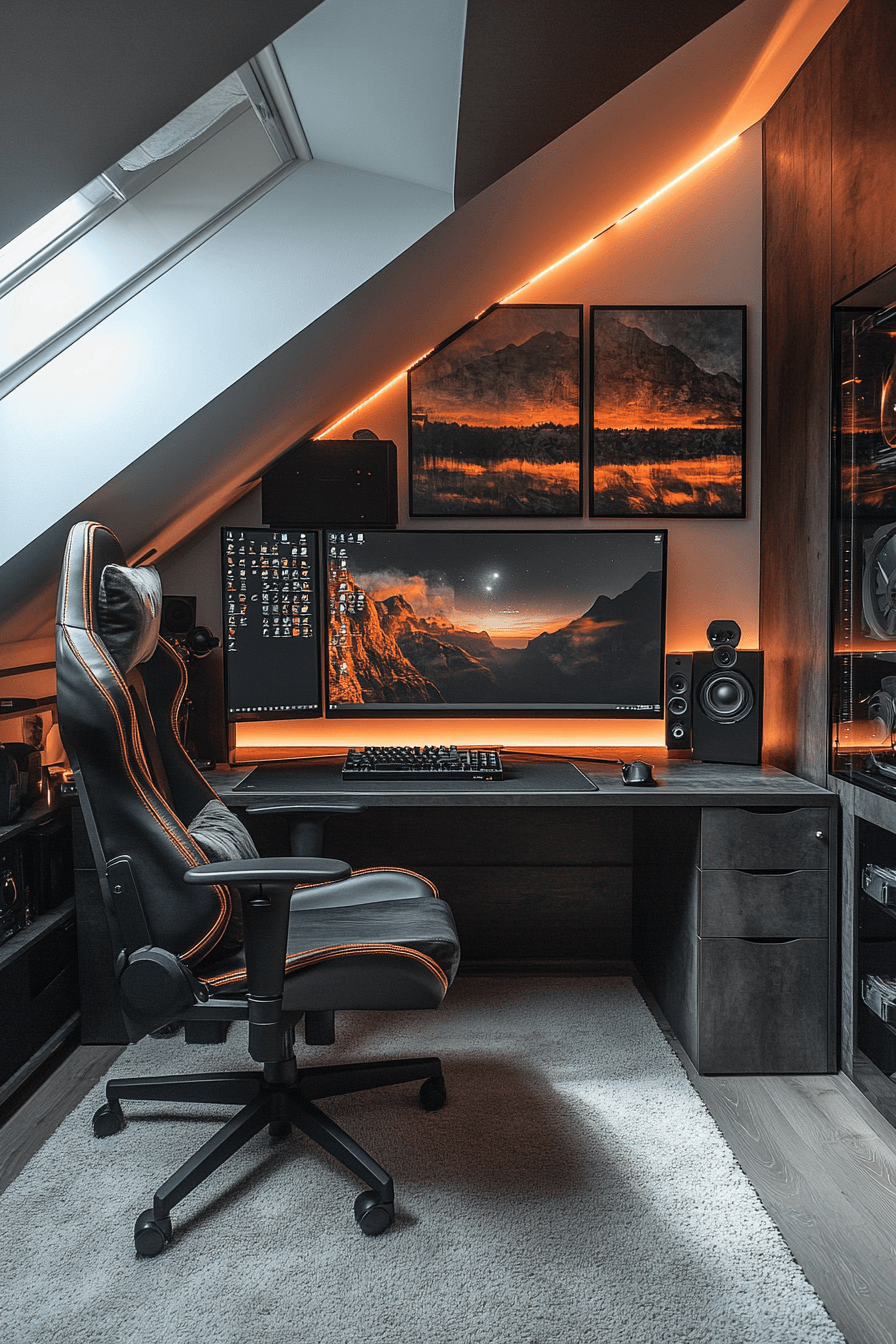 Entertainment setups feel immersive with small attic room ideas that turn the space into a gaming zone. Sloped ceilings frame the layout naturally. LED lighting adds a modern touch. Wall storage keeps everything organized. Comfortable seating enhances the experience. Explore more small attic room ideas for gaming.