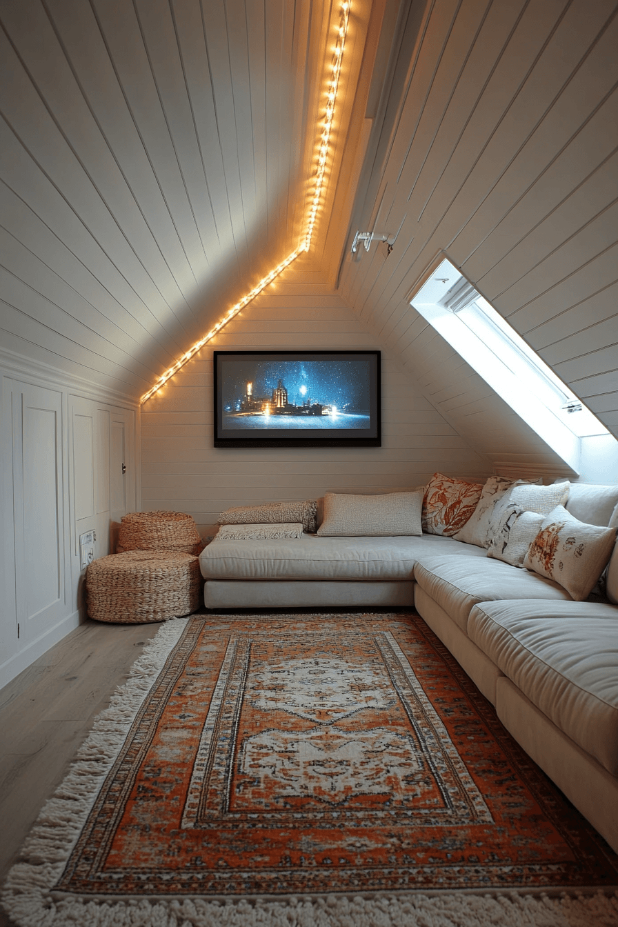 A cozy movie nook transforms small attic room ideas into a relaxing entertainment retreat. A projector or screen keeps the layout simple. Soft blankets and seating add comfort. Dim lighting creates a cinematic feel. The space feels inviting and fun. Discover more small attic room ideas for movie nights.