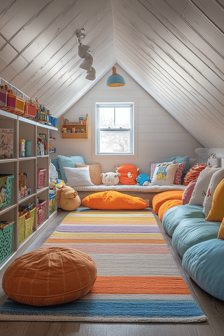 A playful attic space becomes perfect for kids with small attic room ideas designed for fun and creativity. Bright colors bring energy into the room. Small furniture fits perfectly under slopes. Storage keeps toys organized. Soft rugs add comfort. Explore more small attic room ideas for kids’ spaces.