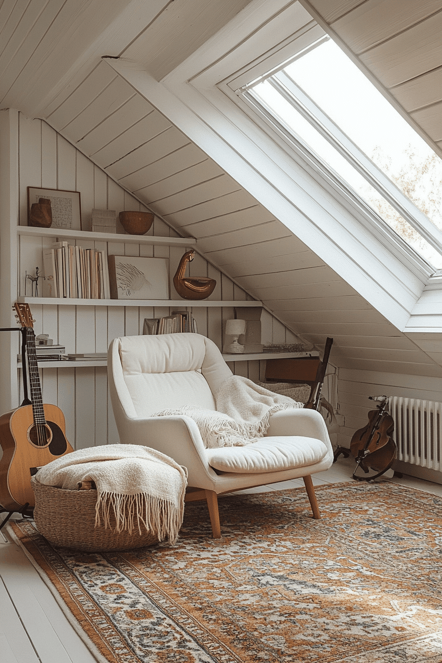 A quiet music corner adds personality to small attic room ideas while creating a dedicated creative space. Simple setups keep everything organized. Soft materials improve acoustics. Minimal decor maintains focus. The space feels inspiring and calm. Discover more small attic room ideas for music lovers.