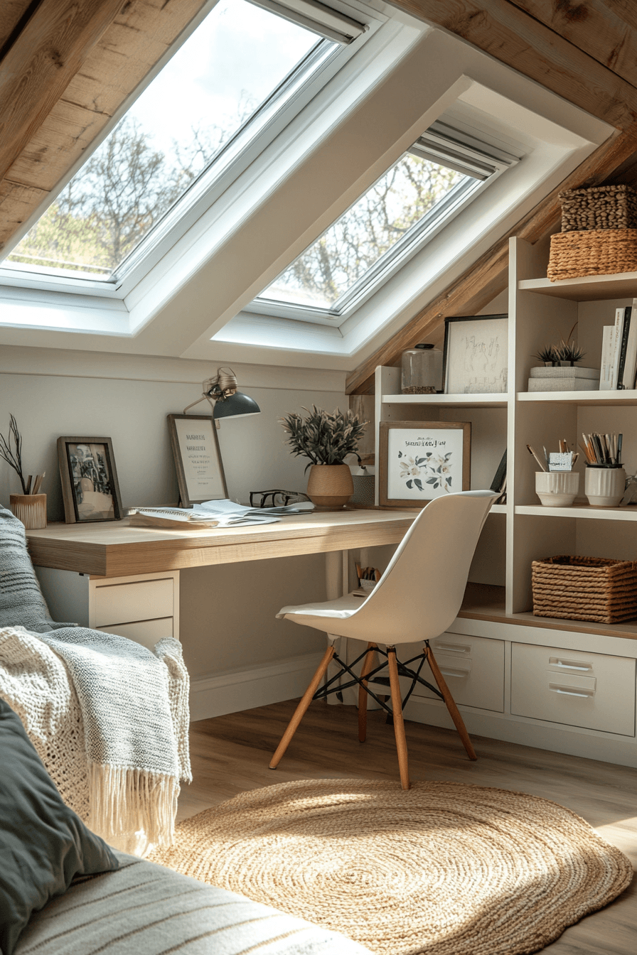 A compact study area fits perfectly into small attic room ideas that focus on productivity and comfort. A simple desk maximizes functionality. Built-in shelving saves space. Natural light enhances focus. Minimal decor reduces distractions. Discover more small attic room ideas for study zones.