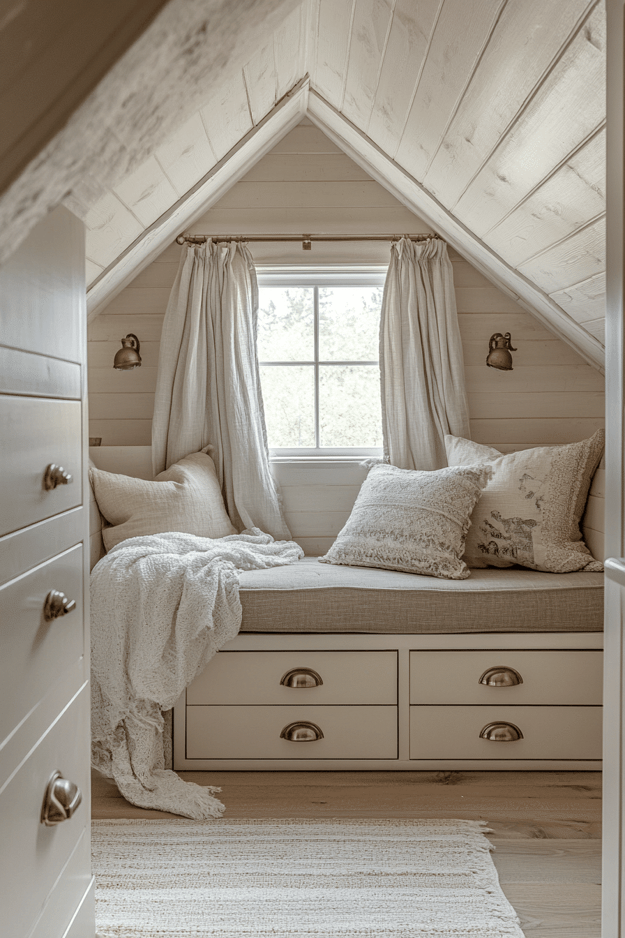Making use of every corner becomes effortless with small attic room ideas like a built-in window seat that blends charm and function. Soft cushions and layered fabrics create a cozy nook for reading or relaxing. Hidden storage underneath keeps everything neat. Light curtains allow natural light to flow through easily. The entire setup feels both practical and inviting. Click to uncover more small attic room ideas that maximize corners beautifully.