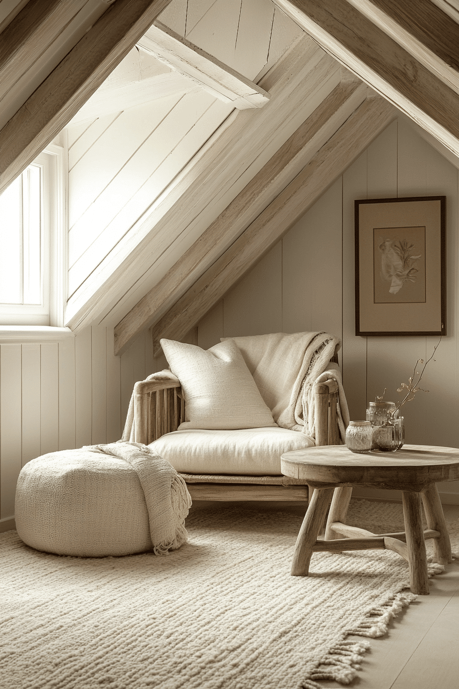 Neutral tones create a soft and welcoming environment in small attic room ideas that feel calm and cozy. Shades of cream, beige, and taupe open up the space visually. Comfortable seating and warm lighting add relaxation. Simple decor keeps everything balanced. Clever storage maintains a clean look. Discover more small attic room ideas with soothing tones.