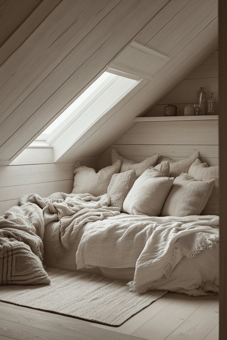 Creating a tucked-away reading corner brings comfort into small attic room ideas with a peaceful and intimate vibe. Floor seating paired with soft rugs adds warmth instantly. A small bookshelf keeps your favorite reads close. Gentle lighting enhances the cozy atmosphere. The sloped ceiling adds character to the space. Explore more small attic room ideas designed for relaxation.