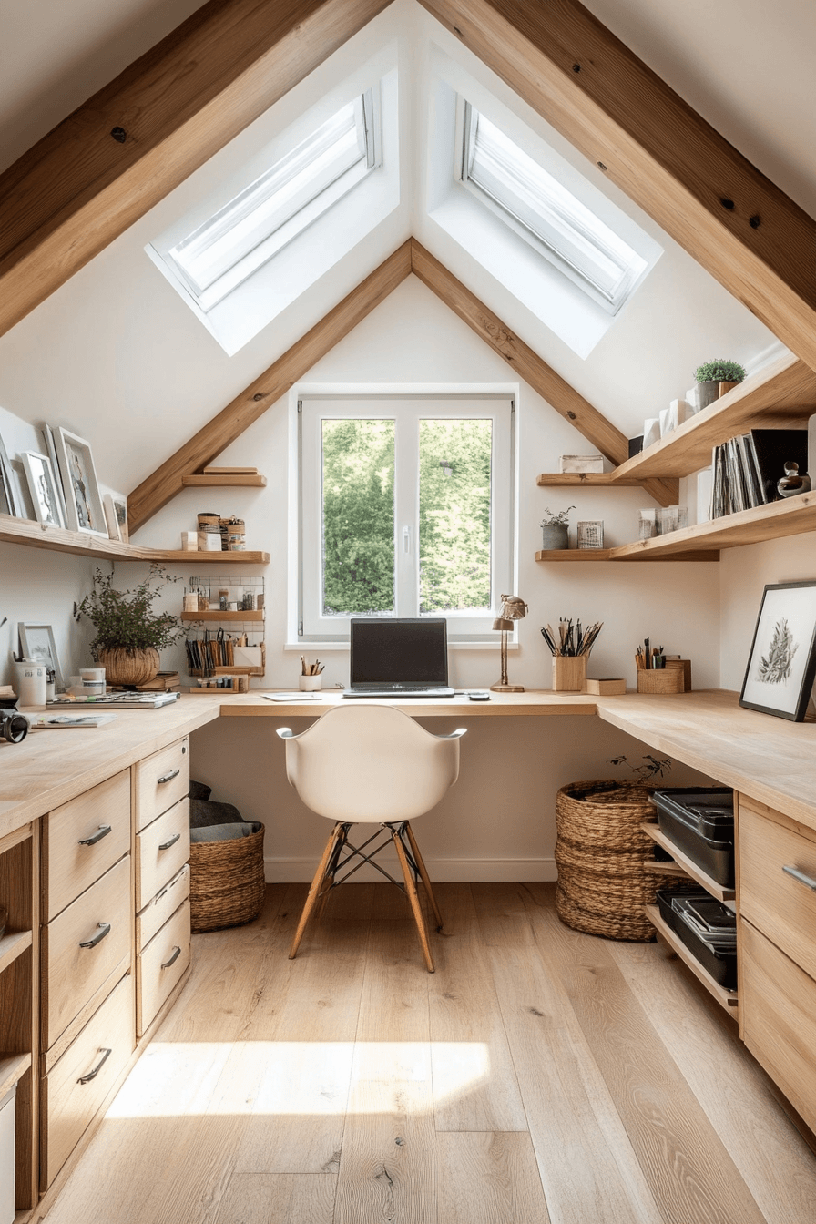 A creative workspace can thrive with small attic room ideas that make the most of natural light and smart layouts. Skylights brighten the space and boost productivity. Compact desks keep the area organized. Open shelving maintains easy access to essentials. Neutral tones create a focused environment. Tap to explore more small attic room ideas for workspaces.