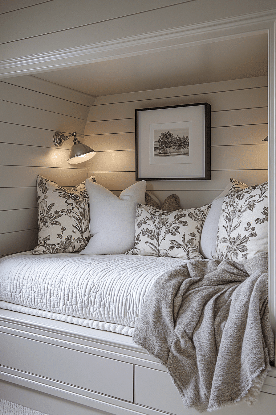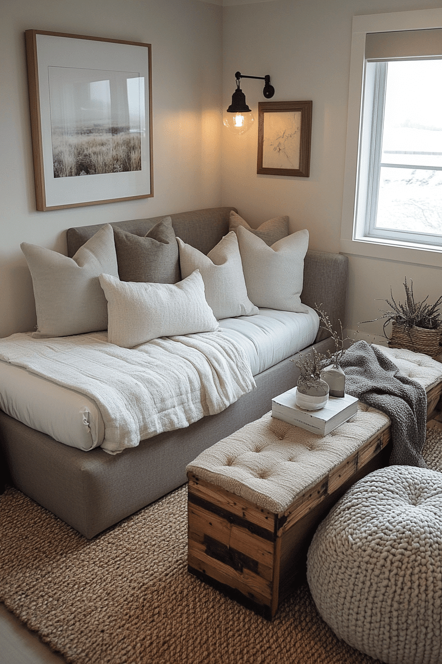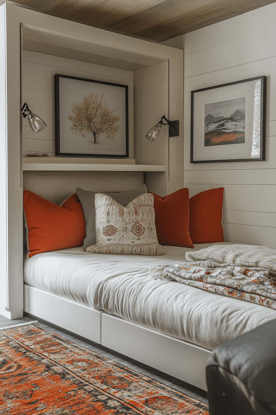 Cozy sleep nooks add warmth and charm to inviting small guest room ideas. A tucked-away bed paired with soft lighting creates an intimate retreat. Small guest room ideas feel especially welcoming with layered textures and neutral tones. Minimal styling keeps the space calm and uncluttered. The result is a relaxing environment guests will appreciate. Turn tiny spaces into dreamy escapes with small guest room ideas that feel extra cozy!