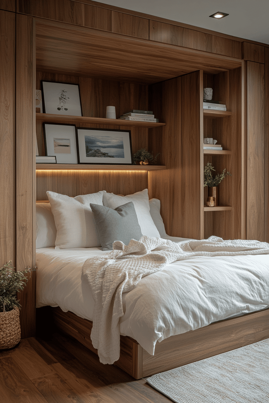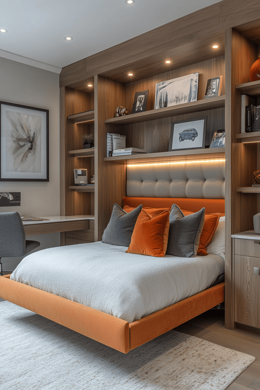 Space-saving innovation defines small guest room ideas that feature hidden or foldable beds. When tucked away, the room instantly becomes more versatile and open. These designs blend seamlessly into cabinetry for a sleek, cohesive look. Small guest room ideas like this make one space serve multiple functions effortlessly. This approach is perfect for compact homes or multi-use rooms. Unlock the potential of small guest room ideas with smart hidden bed solutions!