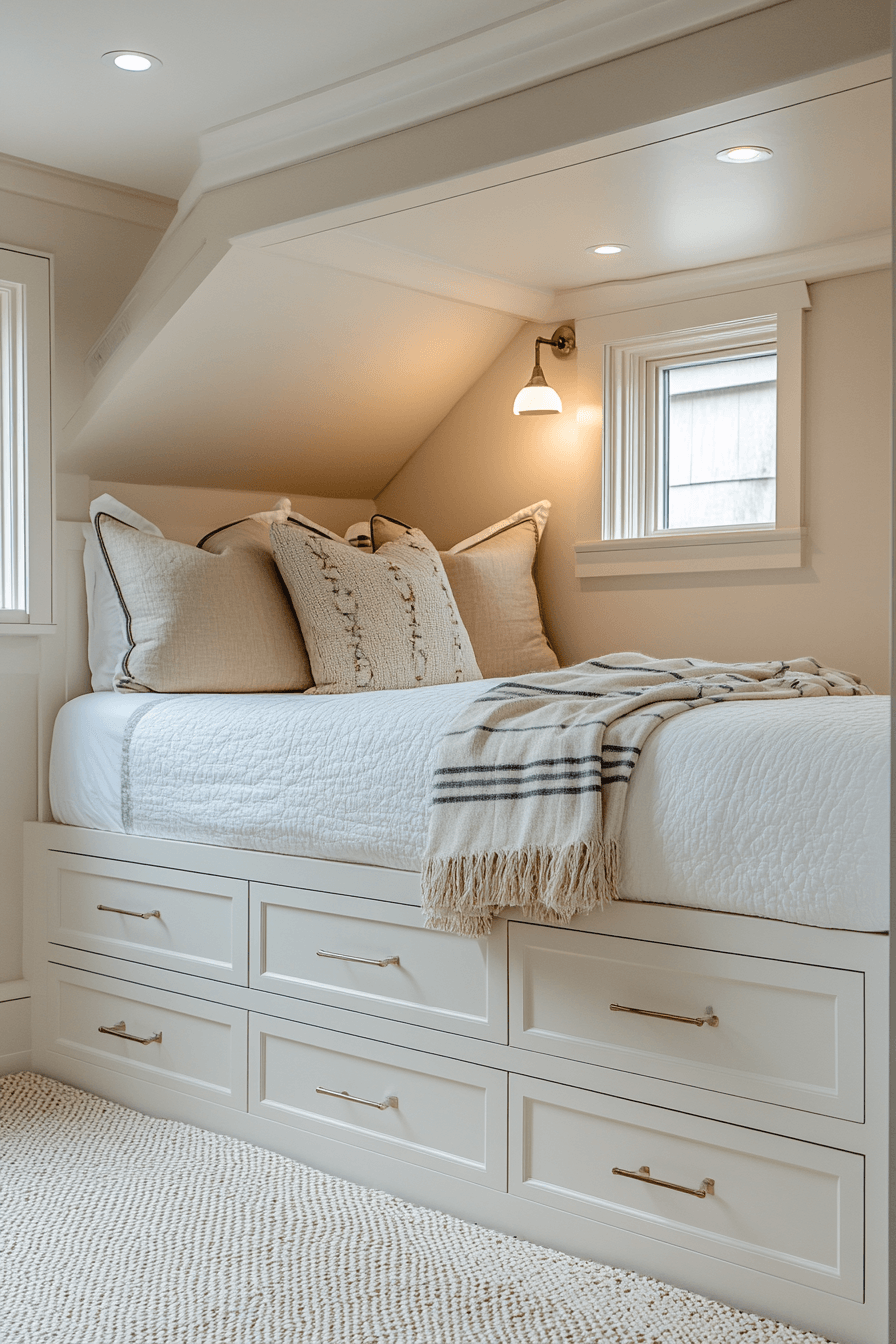 Unique architectural details can become standout features in creative small guest room ideas. Sloped ceilings or angled walls add character when styled thoughtfully. Small guest room ideas benefit from low furniture that fits seamlessly into these spaces. Light colors and soft lighting keep everything bright and open. These features turn challenges into design highlights. Embrace the charm of small guest room ideas that celebrate unique layouts!